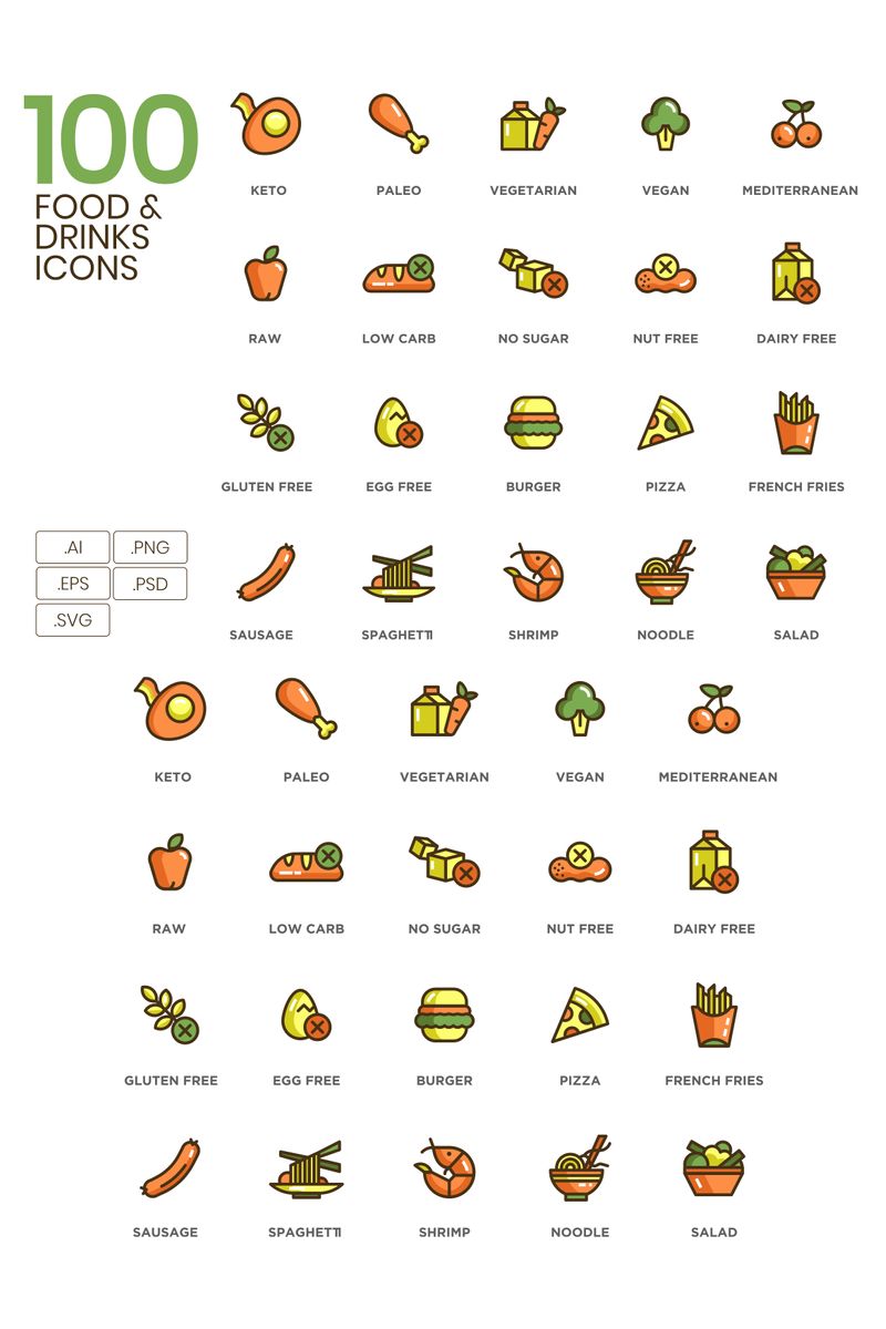Download Набор иконок "100 Food _ Drinks Icons - Eco Series Set" / 100 Food _ Drinks Icons - Eco Series Set - Набор иконок на тему графика