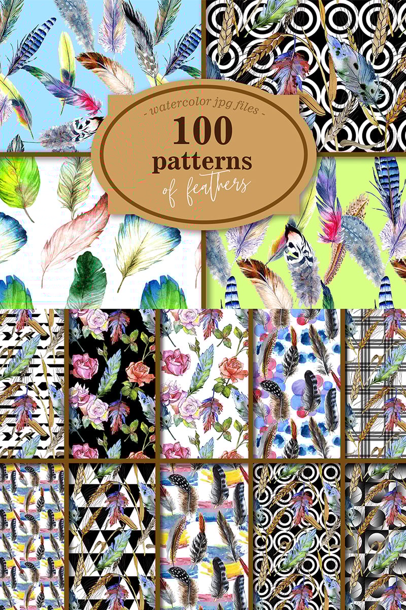 Download Иллюстрация "100 Patterns of Feather JPG Watercolor Set - Illustration" / 100 Patterns of Feather JPG Watercolor Set - Illustration - Иллюстрация на тему графика watercolor illustration pattern drawing background colorful drawn paint fruit 100 boho quill plume wing isolated seamless texture wallpaper fabric bird