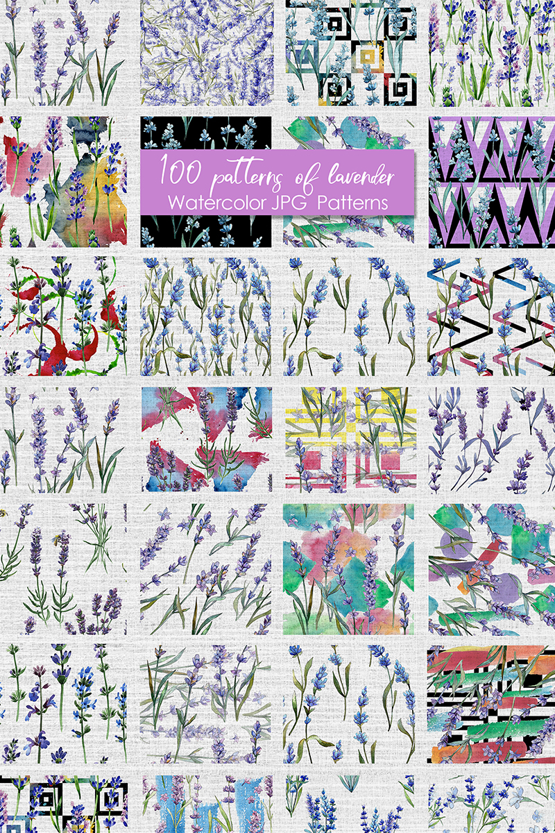 Download Иллюстрация "100 Patterns Of Lavender Flower JPG Watercolor Set - Illustration" / 100 Patterns Of Lavender Flower JPG Watercolor Set - Illustration - Иллюстрация на тему графика watercolor illustration pattern drawing background colorful drawn purple paint 100 seamless texture wallpaper fabric ornament print tile flower decoration petal