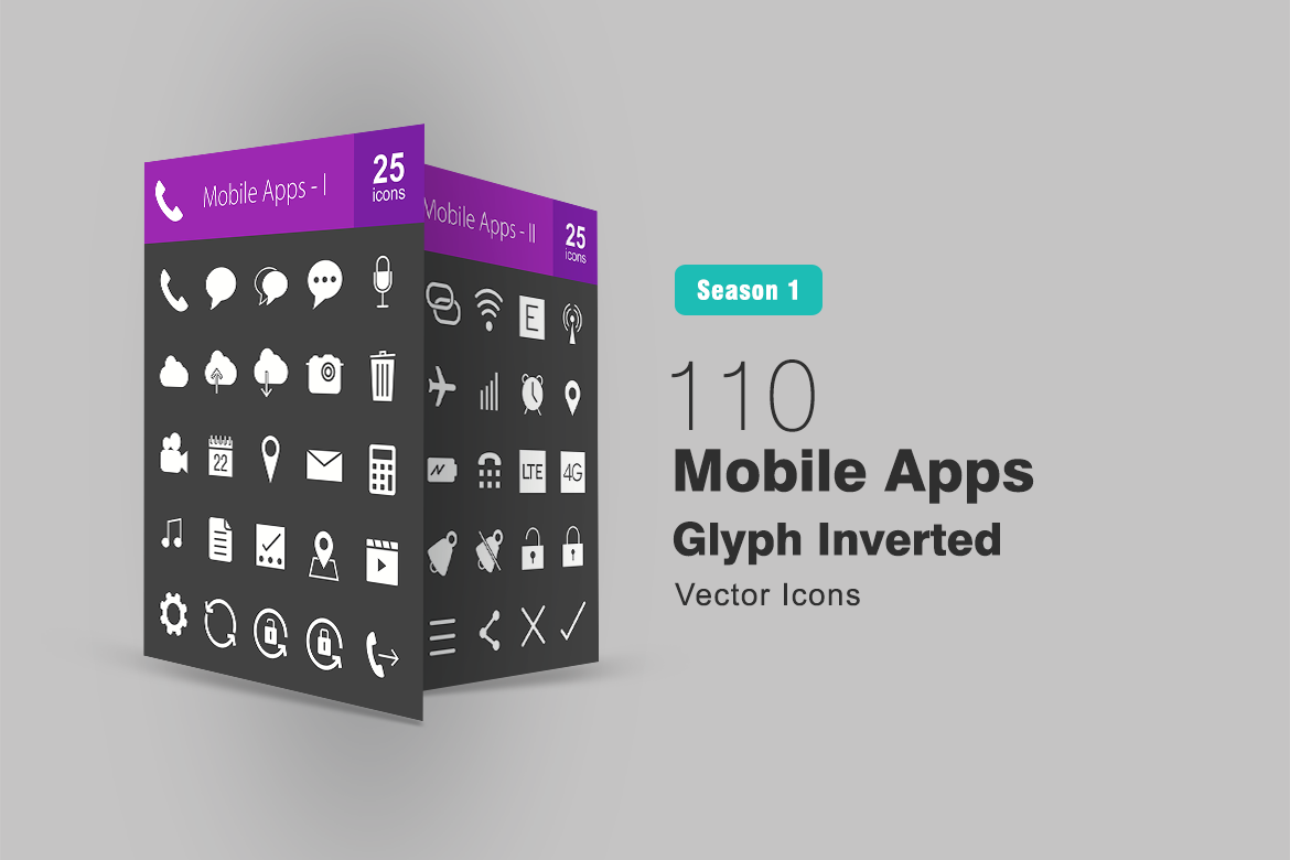Download Набор иконок "110 Mobile Apps Glyph Inverted Icon Set" / 110 Mobile Apps Glyph Inverted Icon Set - Набор иконок на тему графика mobile apps icon camera calendar themes wallpaper gallery signals phone music messaging maps email downloads audio sounds technology iconbunny flat