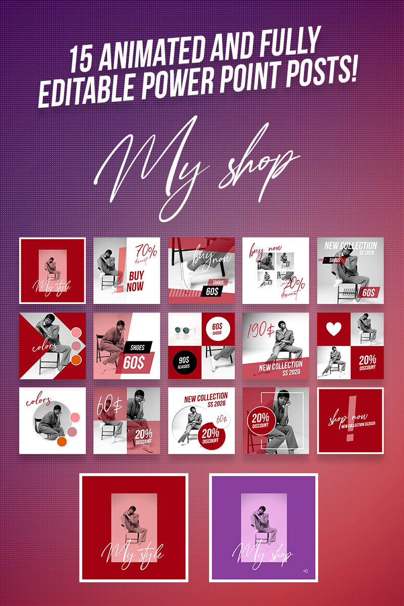 Download Шаблон для соцсетей "15 animated and fully editable Power Point posts! 1 post in 15 ways. Simple and for everyone! Social Media Template" / 15 animated and fully editable Power Point posts! 1 post in 15 ways. Simple and for everyone! Social Media Template - Шаблон для соцсетей на тему графика powerpoint social media animation post fashion shop beauty minimalism simple operation universal