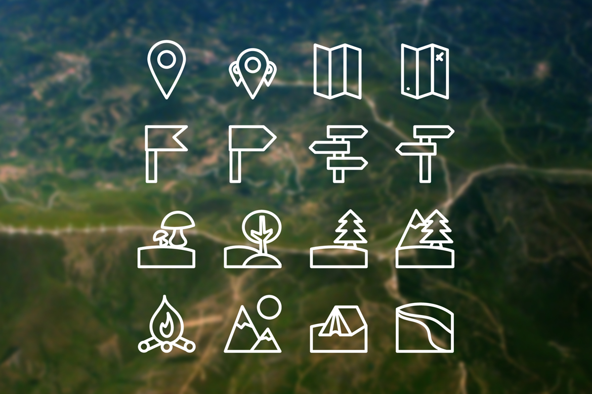 Download Набор иконок "16 Camping Icon Set" / 16 Camping Icon Set - Набор иконок на тему travel hiking,hill,tree,icon,park,map,travel,vector,field,camp,walk,picnic,trekking,pointer,mushroom,recreation,tent,forest,expedition,fire