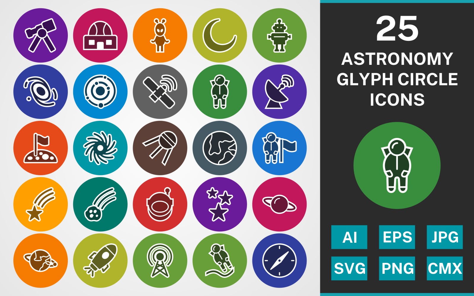 Download Набор иконок "25 ASTRONOMY GLYPH CIRCLE PACK Icon Set" / 25 ASTRONOMY GLYPH CIRCLE PACK Icon Set - Набор иконок на тему science set,file,icon,icons,linear,glyph,vector,sign,symbol,pictogram,circle,astronomy,telescope,astronout,earth,space suit,galaxy,broadcast,black hole,space station