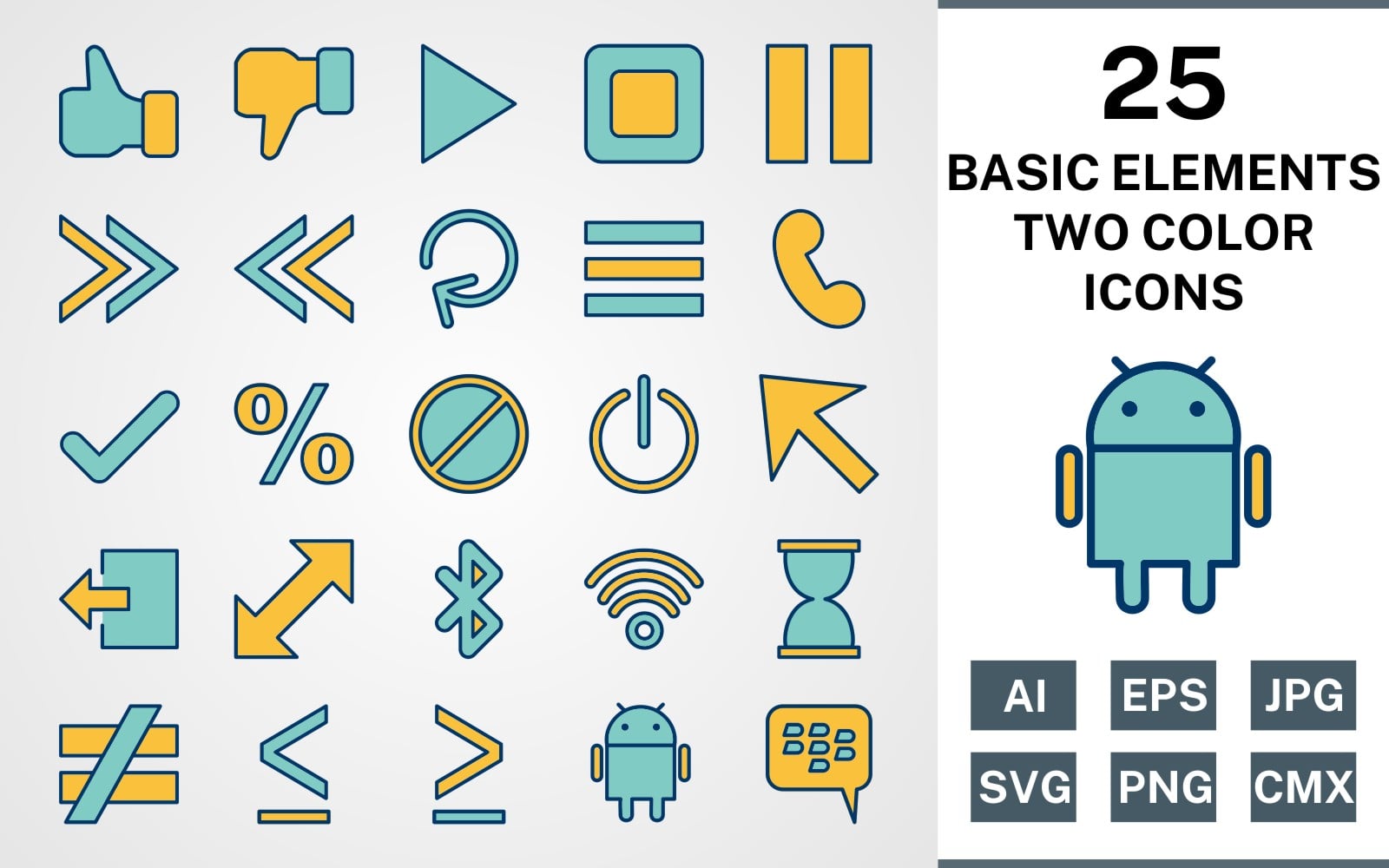 Download Набор иконок "25 BASIC ELEMENTS FILLED TWO COLORS PACK Icon Set" / 25 BASIC ELEMENTS FILLED TWO COLORS PACK Icon Set - Набор иконок на тему data set,file,icon,icons,filled,round,vector,sign,symbol,pictogram,two colors,basic elements,tick,call,reload,menu,wifi,hourglass,android,pause