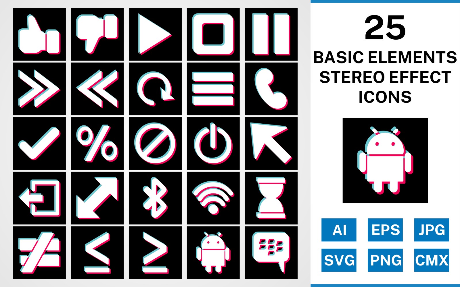 Download Набор иконок "25 Basic Elements Stereo Effect Icon Set" / 25 Basic Elements Stereo Effect Icon Set - Набор иконок на тему data set,file,stereo,icon,icons,glyph,vector,sign,symbol,pictogram,effect,basic elements,play,stop,tick,like,cursor,android,blackberry,menu