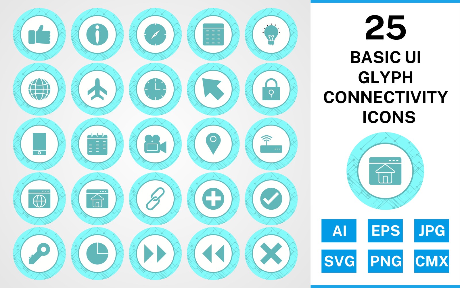 Download Набор иконок "25 Basic ui Glyph Connectivity Icon Set" / 25 Basic ui Glyph Connectivity Icon Set - Набор иконок на тему data set,file,icon,icons,glyph,vector,sign,symbol,pictogram,connectivity,basic ui,browser,wifi,homepage,location,video,lock,cursor,globe,pie chart