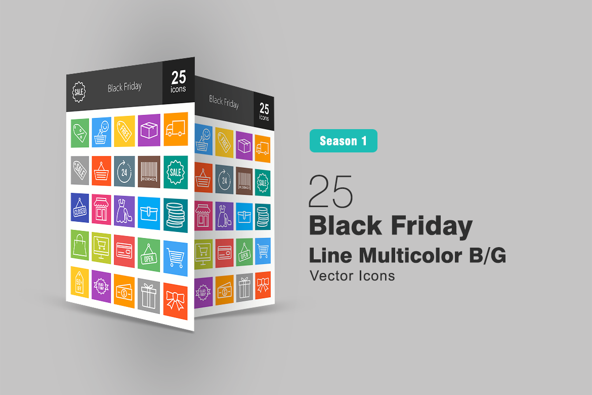 Download Набор иконок "25 Black Friday Line Multicolor B/G Icon Set" / 25 Black Friday Line Multicolor B/G Icon Set - Набор иконок на тему графика discount icon black friday observance happy customer free parcel delivery tag sale shopping limitedtimeoffer barcode closed shop ladies wallet coins