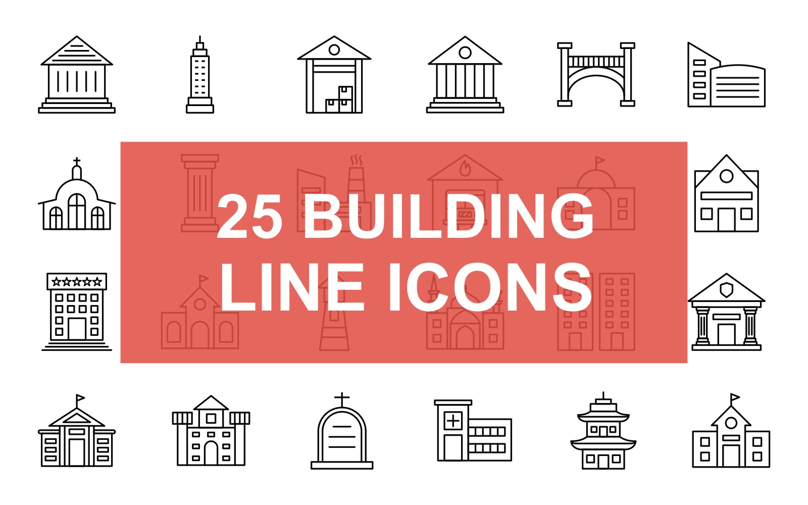 Download Набор иконок "25 Building Line Icon Set" / 25 Building Line Icon Set - Набор иконок на тему графика bank,bridge,building,castle,church,factory,fir,station,home,house,hospital,hotel,library,lighthouse,mosque,museum,office,temple,school,university