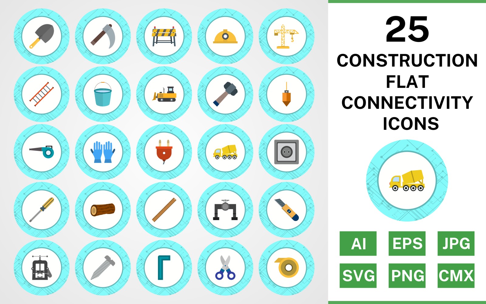 Download Набор иконок "25 Construction Flat Connectivity Icon Set" / 25 Construction Flat Connectivity Icon Set - Набор иконок на тему industrial set,file,icon,icons,flat,vector,sign,symbol,pictogram,connectivity,construction,trowel,ladder,bucket,vise,ruler,helmet,hammer,bulldozer