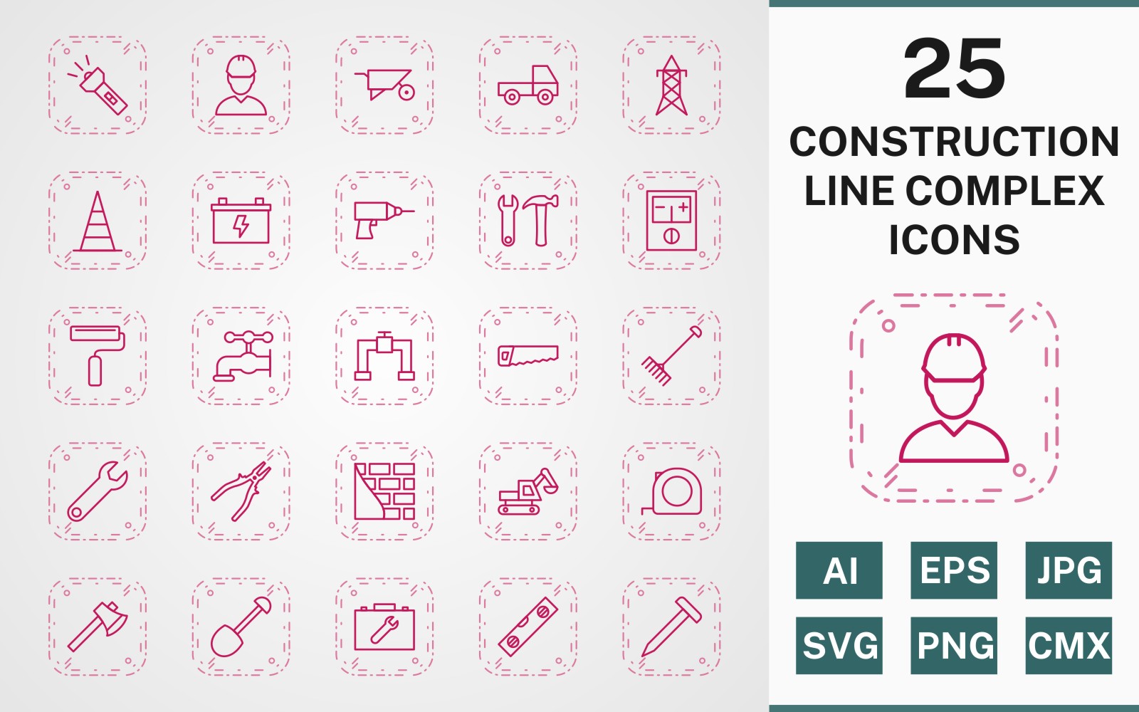 Download Набор иконок "25 CONSTRUCTION LINE COMPLEX PACK Icon Set" / 25 CONSTRUCTION LINE COMPLEX PACK Icon Set - Набор иконок на тему industrial icon,icons,linear,set,file,line,vector,sign,symbol,pictogram,complex,construction,engineer,loader,tools,tool box,drill,paint roller,pipe,saw