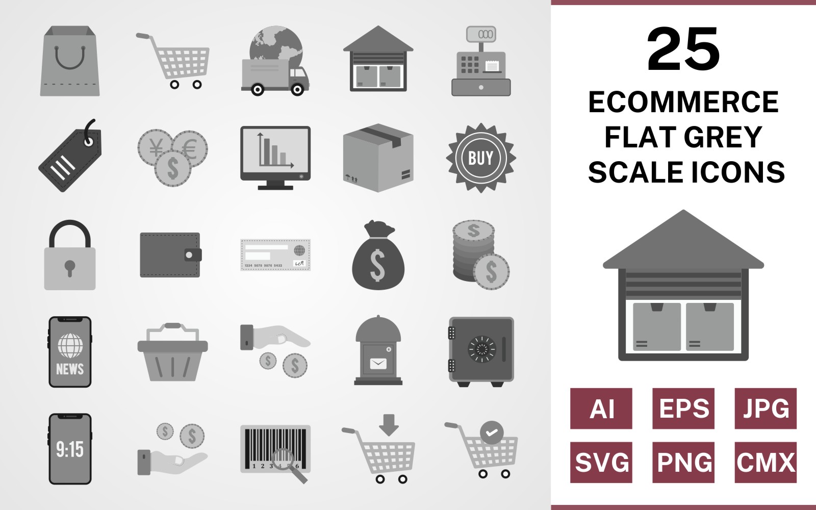 Download Набор иконок "25 Ecommerce Flat Greyscale Icon Set" / 25 Ecommerce Flat Greyscale Icon Set - Набор иконок на тему shopping set,file,icon,icons,flat,vector,sign,symbol,pictogram,greyscale,ecommerce,buy,security,tag,vault,add to cart,payment,basket,cheque