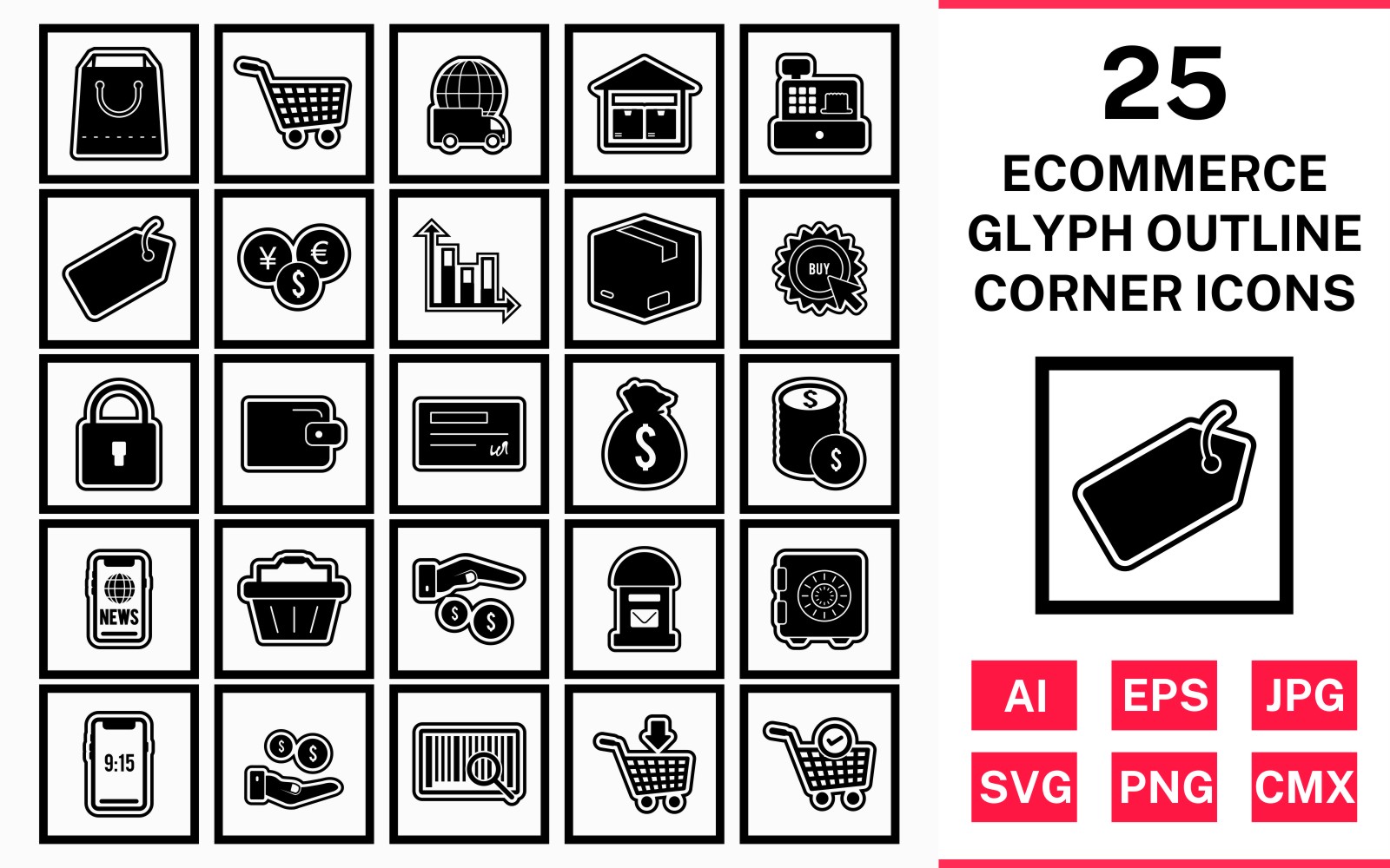 Download Набор иконок "25 Ecommerce Glyph Outline Square Corner Icon Set" / 25 Ecommerce Glyph Outline Square Corner Icon Set - Набор иконок на тему shopping set,file,icon,icons,outline,vector,sign,symbol,pictogram,glyph,square,corner,ecommerce,buy,security,tag,vault,add to cart,payment,basket