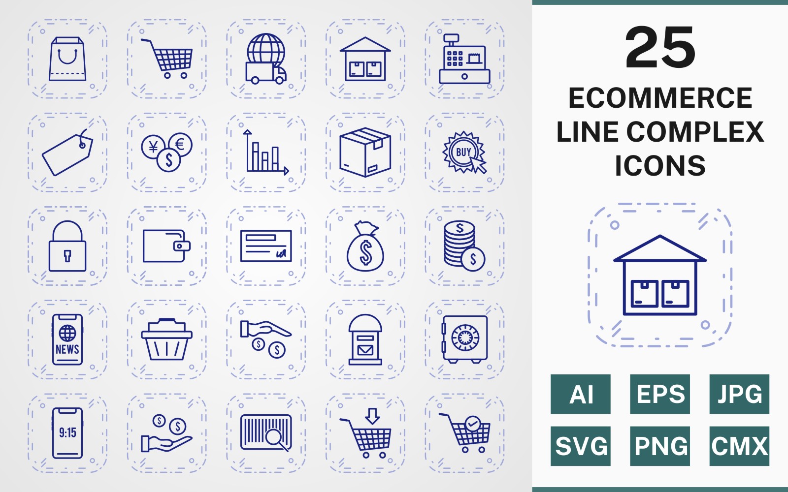 Download Набор иконок "25 ECOMMERCE LINE COMPLEX ICON PACK Set" / 25 ECOMMERCE LINE COMPLEX ICON PACK Set - Набор иконок на тему shopping icon,icons,linear,set,file,line,vector,sign,symbol,pictogram,complex,ecommerce,buy,security,tag,vault,add to cart,payment,basket,cheque