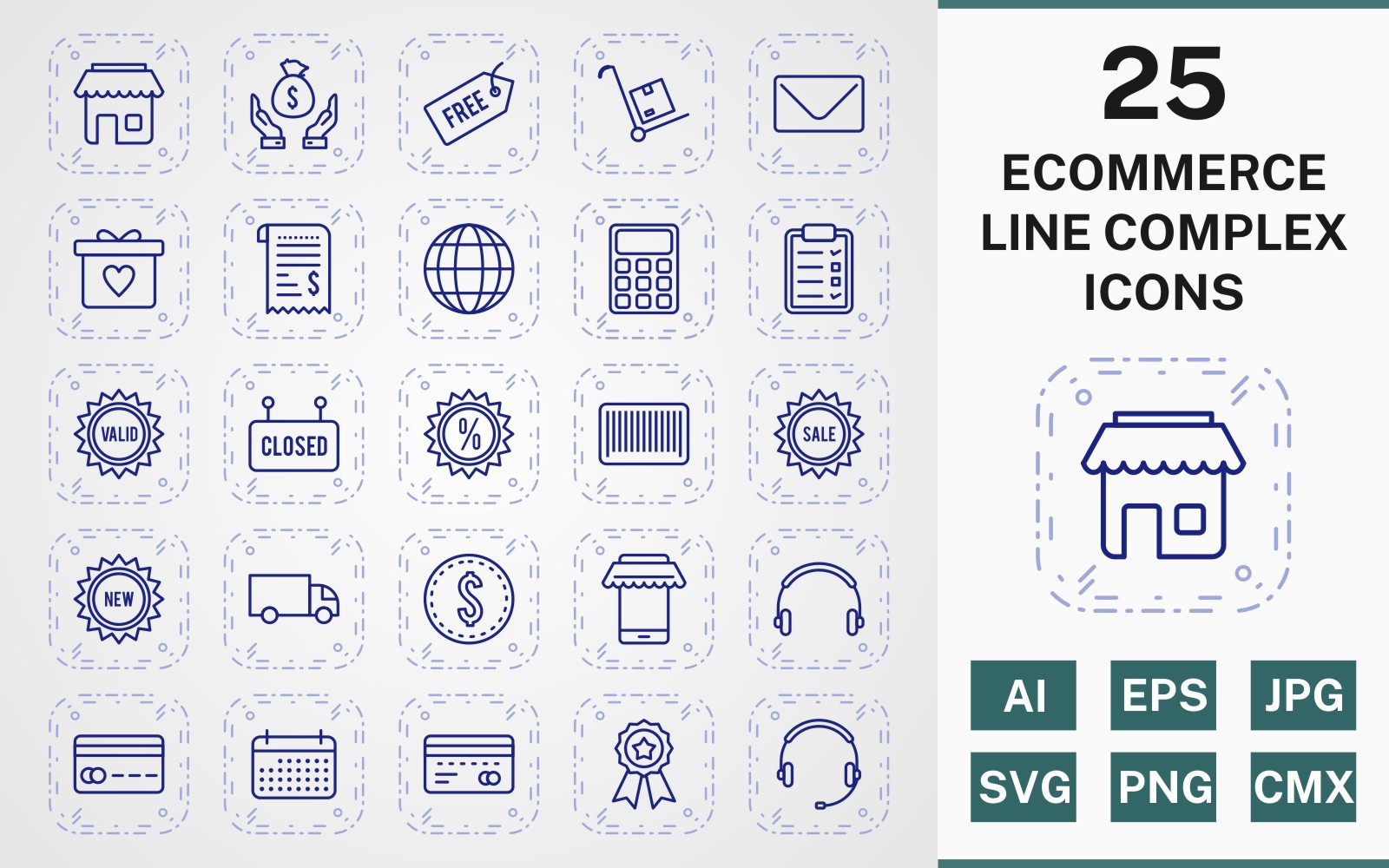 Download Набор иконок "25 ECOMMERCE LINE COMPLEX ICON PACK Set" / 25 ECOMMERCE LINE COMPLEX ICON PACK Set - Набор иконок на тему shopping icon,icons,linear,set,file,line,vector,sign,symbol,pictogram,complex,ecommerce,envelope,saving,trolley,new,sale,atm,shop,discount
