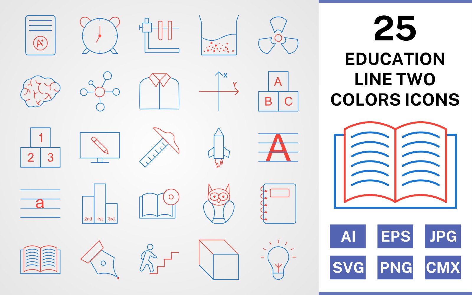 Download Набор иконок "25 Education Line Two Colors Icon Set" / 25 Education Line Two Colors Icon Set - Набор иконок на тему science set,file,icon,icons,line,vector,sign,symbol,pictogram,two,colors,education,brain,cube,book dvd,open book,electron,alarm,notepad,radiation