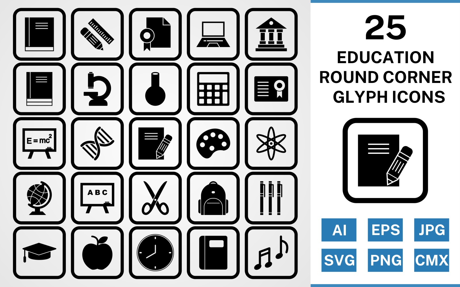 Download Набор иконок "25 Education Round Corner Glyph Black Icon Set" / 25 Education Round Corner Glyph Black Icon Set - Набор иконок на тему science set,file,icon,icons,round,vector,sign,symbol,pictogram,corner,glyph,education,books,bagpack,notebook,flask,microscope,notes,markers,calculator