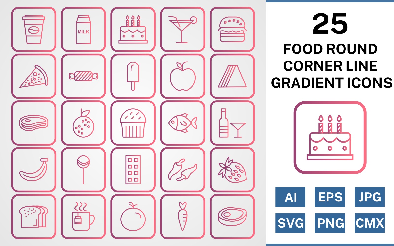 Download Набор иконок "25 Food Round Corner Line Gradient Icon Set" / 25 Food Round Corner Line Gradient Icon Set - Набор иконок на тему food set,file,icon,icons,round,corner,vector,sign,symbol,pictogram,line gradient,food,coffee,milk,snack,carrot,steak,orange,pizza,cake