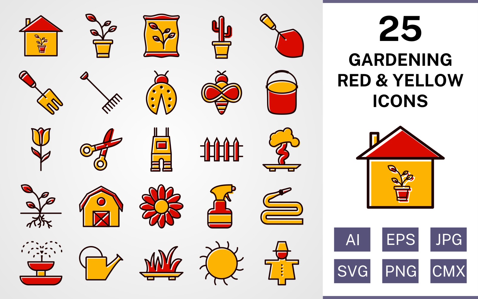 Download Набор иконок "25 Gardening Filled Red And Yellow Icon Set" / 25 Gardening Filled Red And Yellow Icon Set - Набор иконок на тему nature set,file,icon,icons,red,vector,sign,symbol,pictogram,yellow,filled,gardening,sprout,pail,hose,barn,root,grass,watercan,trowel
