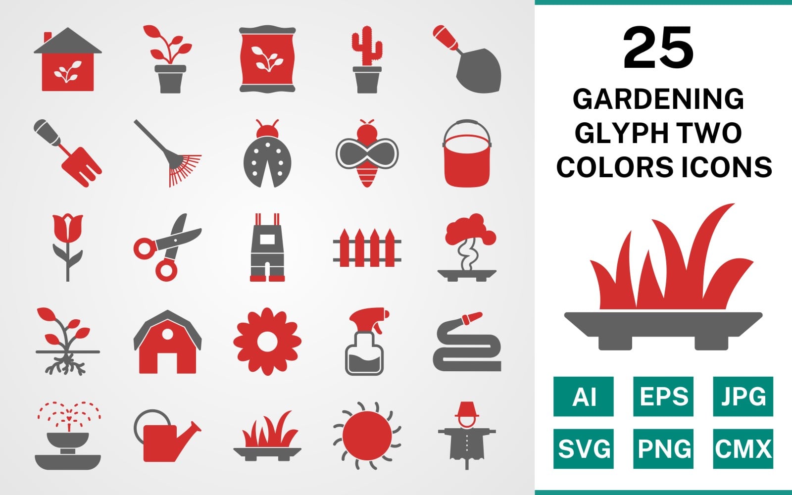 Download Набор иконок "25 Gardening Glyph Two Colors Icon Set" / 25 Gardening Glyph Two Colors Icon Set - Набор иконок на тему nature set,file,icon,icons,glyph,vector,sign,symbol,pictogram,two colors,gardening,sprout,pail,hose,barn,root,grass,watercan,trowel