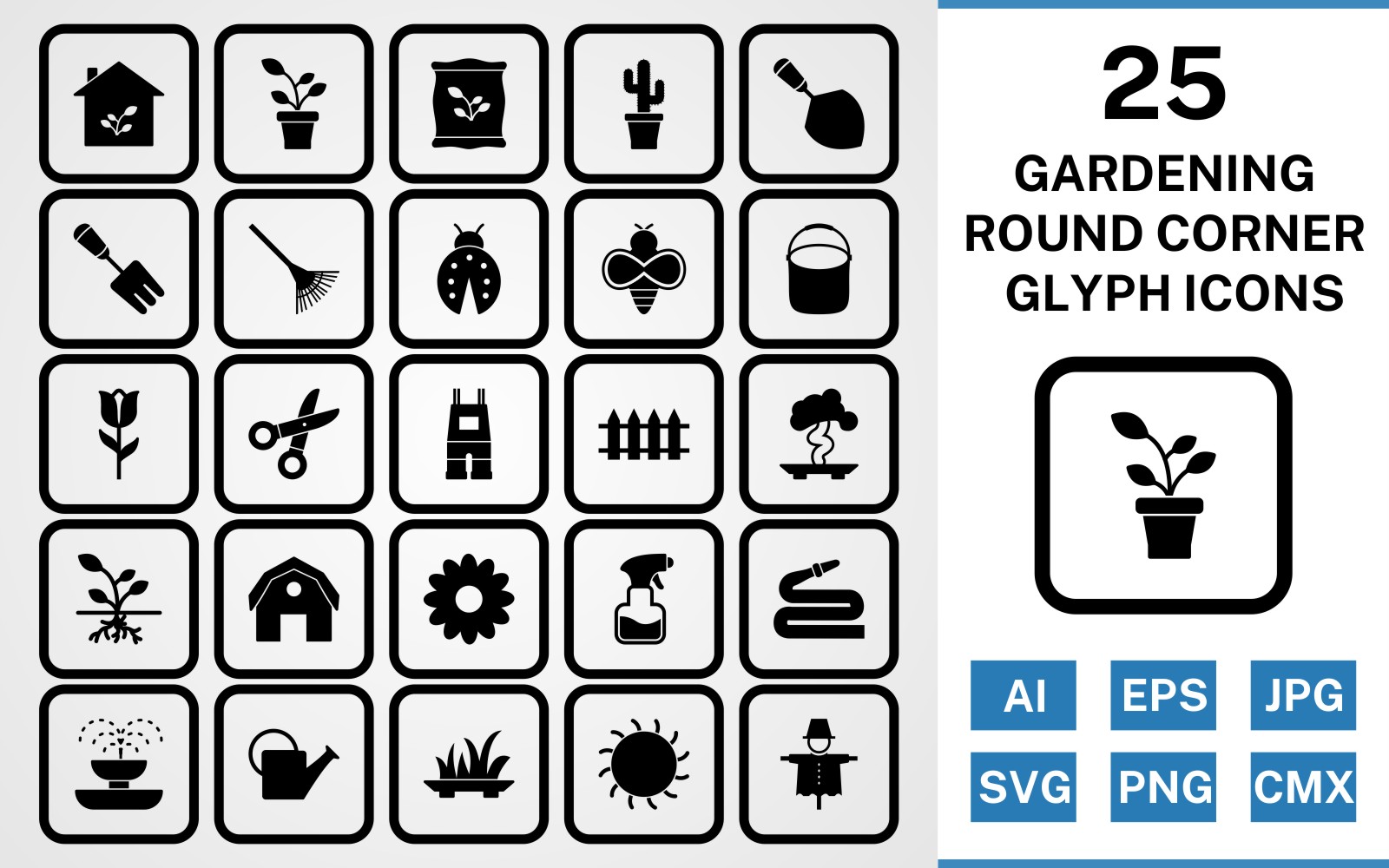 Download Набор иконок "25 Gardening Round Corner Glyph Black Icon Set" / 25 Gardening Round Corner Glyph Black Icon Set - Набор иконок на тему nature set,file,icon,icons,round,vector,sign,symbol,pictogram,corner,glyph,gardening,sprout,pail,hose,barn,root,grass,watercan,trowel
