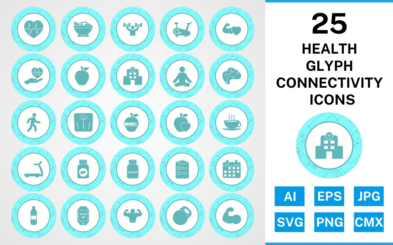 Download Набор иконок "25 Health Glyph Connectivity Icon Set" / 25 Health Glyph Connectivity Icon Set - Набор иконок на тему food set,file,icon,icons,glyph,vector,sign,symbol,pictogram,connectivity,health,yoga,salad,heart beat,walking,body,hospital,apple,healthy food