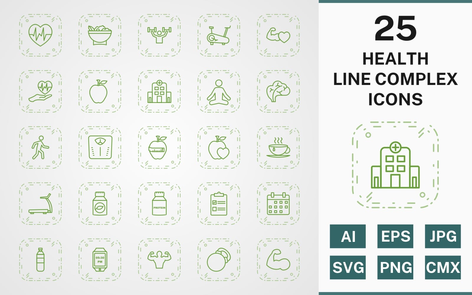 Download Набор иконок "25 HEALTH LINE COMPLEX ICON PACK Set" / 25 HEALTH LINE COMPLEX ICON PACK Set - Набор иконок на тему food icon,icons,linear,set,file,line,vector,sign,symbol,pictogram,complex,health,yoga,salad,heart beat,walking,body,hospital,apple,healthy food