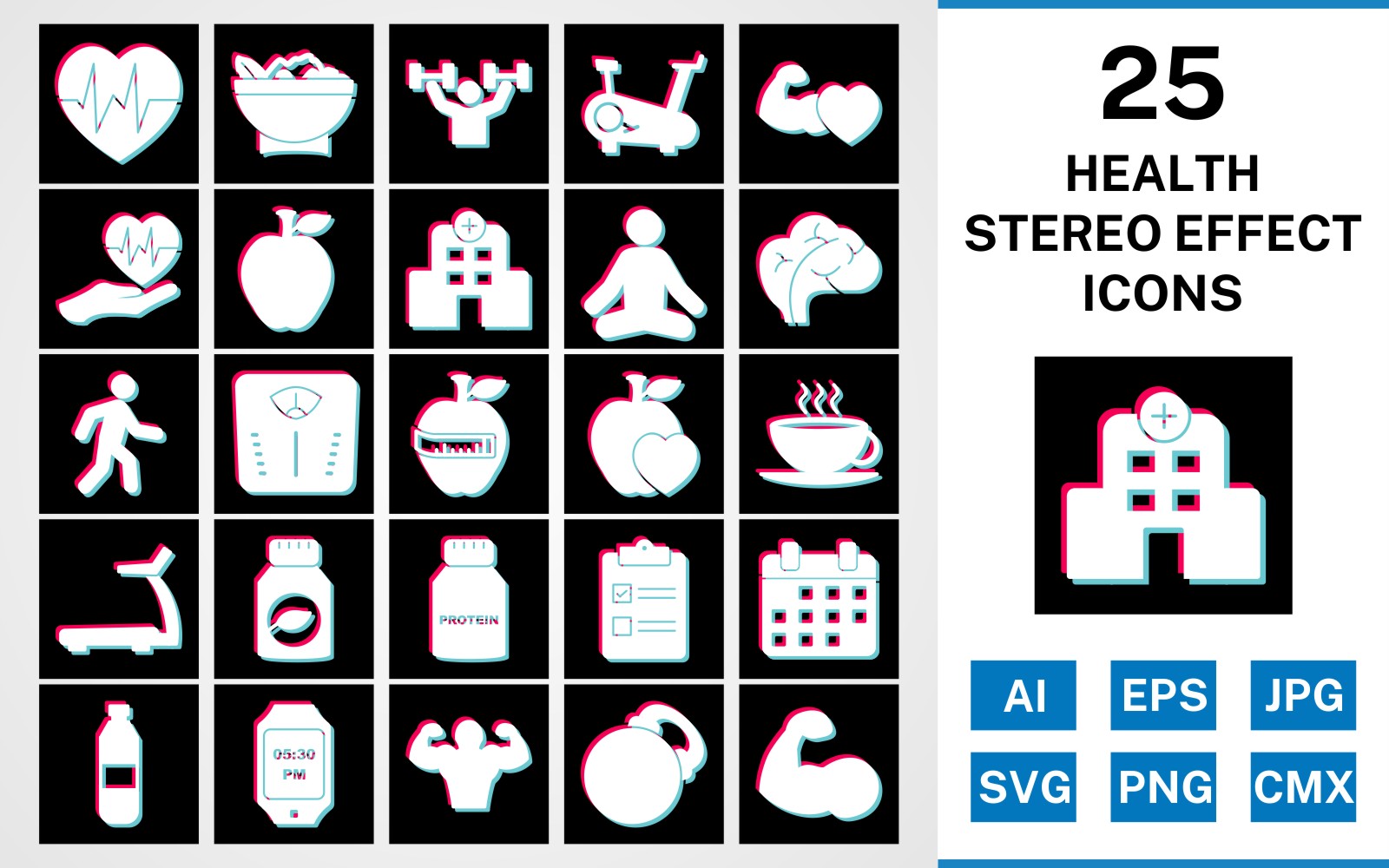Download Набор иконок "25 Health Stereo Effect Icon Set" / 25 Health Stereo Effect Icon Set - Набор иконок на тему food set,file,stereo,icon,icons,glyph,vector,sign,symbol,pictogram,effect,health,yoga,salad,heart beat,walking,body,hospital,apple,healthy food