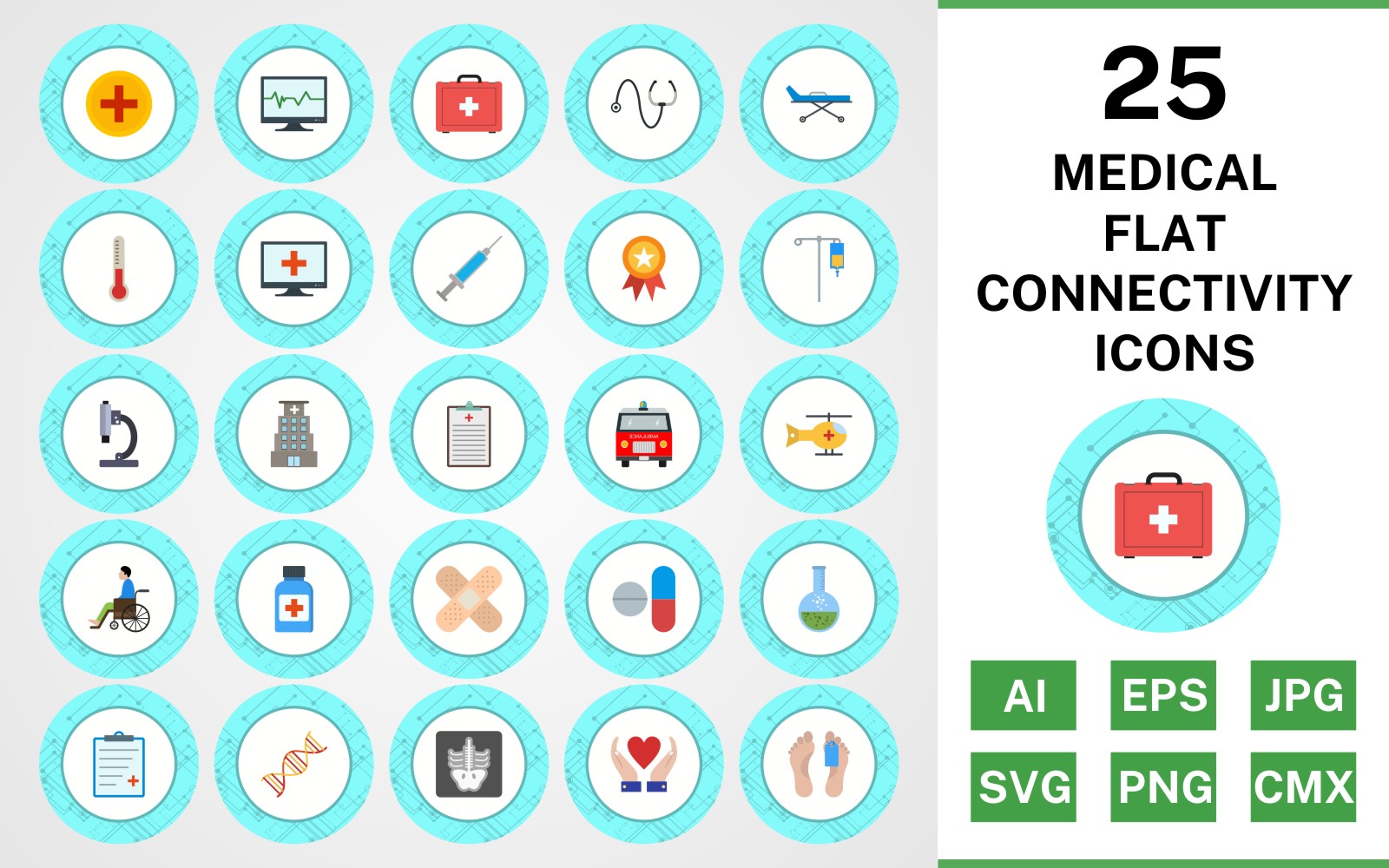 Download Набор иконок "25 Medical Flat Connectivity Icon Set" / 25 Medical Flat Connectivity Icon Set - Набор иконок на тему medical set,file,icon,icons,flat,vector,sign,symbol,pictogram,connectivity,medical,drip,xray,dna,report,toe tag,medicines,hospital,injection,ambulance