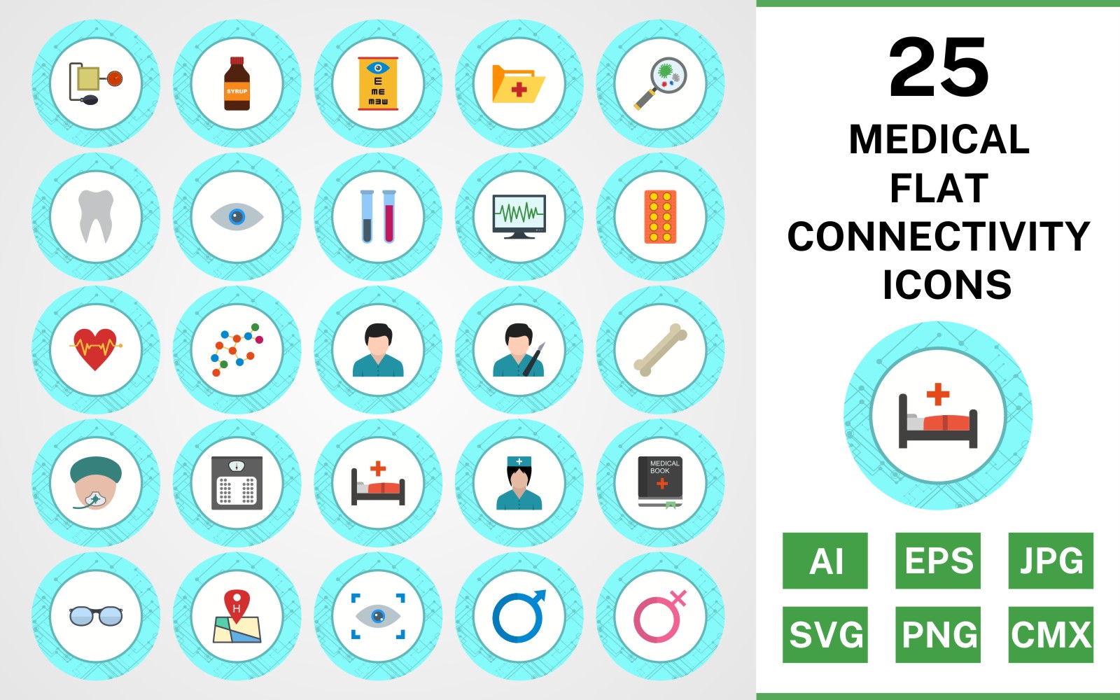 Download Набор иконок "25 Medical Flat Connectivity Icon Set" / 25 Medical Flat Connectivity Icon Set - Набор иконок на тему medical set,file,icon,icons,flat,vector,sign,symbol,pictogram,connectivity,medical,doctor,nurse,bed,scan,eye test,bp apparatus,bone,tablets,test tubes
