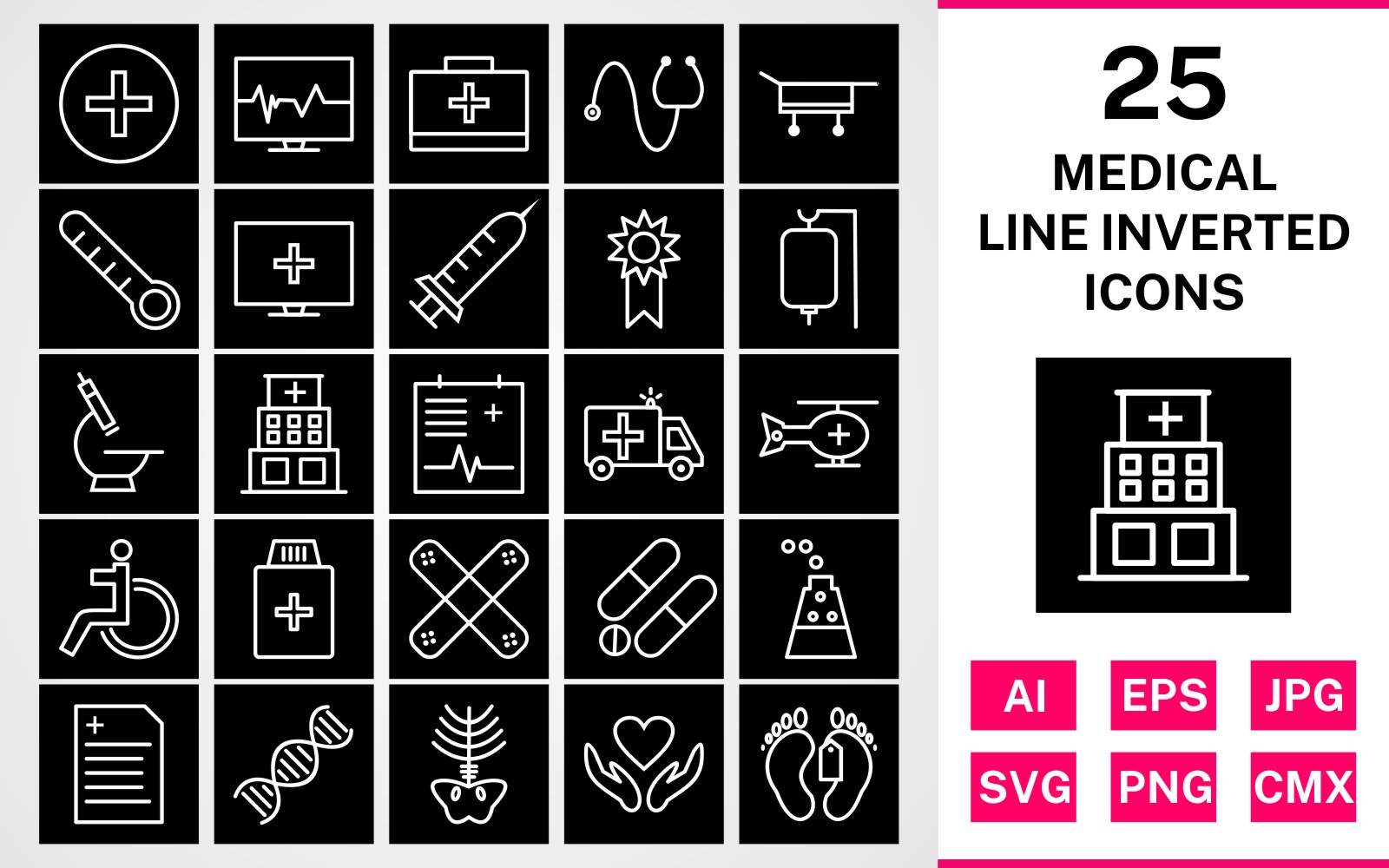 Download Набор иконок "25 Medical Line Inverted Icon Set" / 25 Medical Line Inverted Icon Set - Набор иконок на тему medical set,file,icon,icons,line,circle,vector,sign,symbol,pictogram,inverted,medical,drip,xray,dna,report,toe tag,medicines,hospital,injection