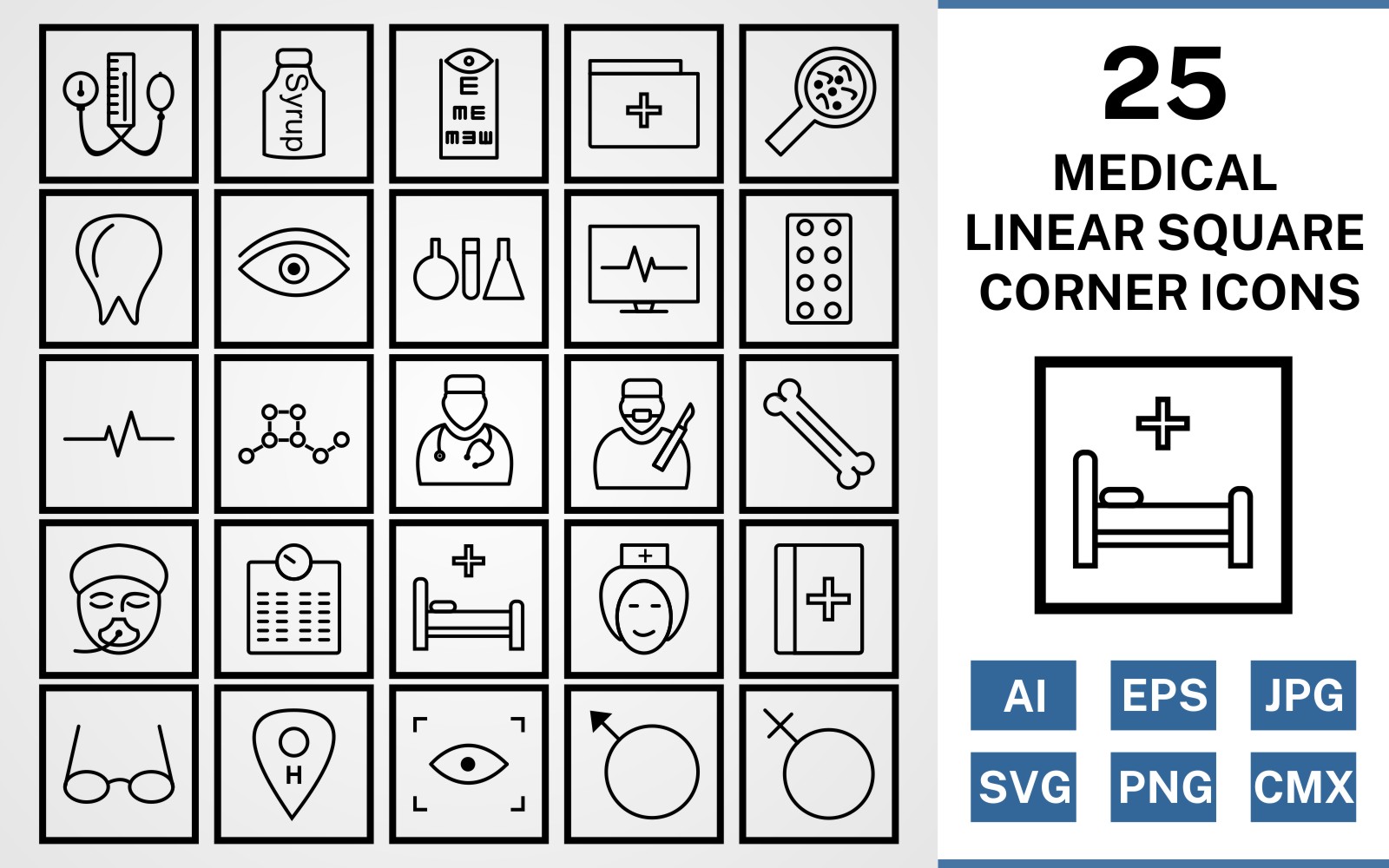 Download Набор иконок "25 Medical Linear Square Corner Pack Icon Set" / 25 Medical Linear Square Corner Pack Icon Set - Набор иконок на тему medical set,file,icon,icons,square,linear,vector,sign,symbol,pictogram,corner,medical,doctor,nurse,bed,scan,eye test,bp apparatus,bone,tablets