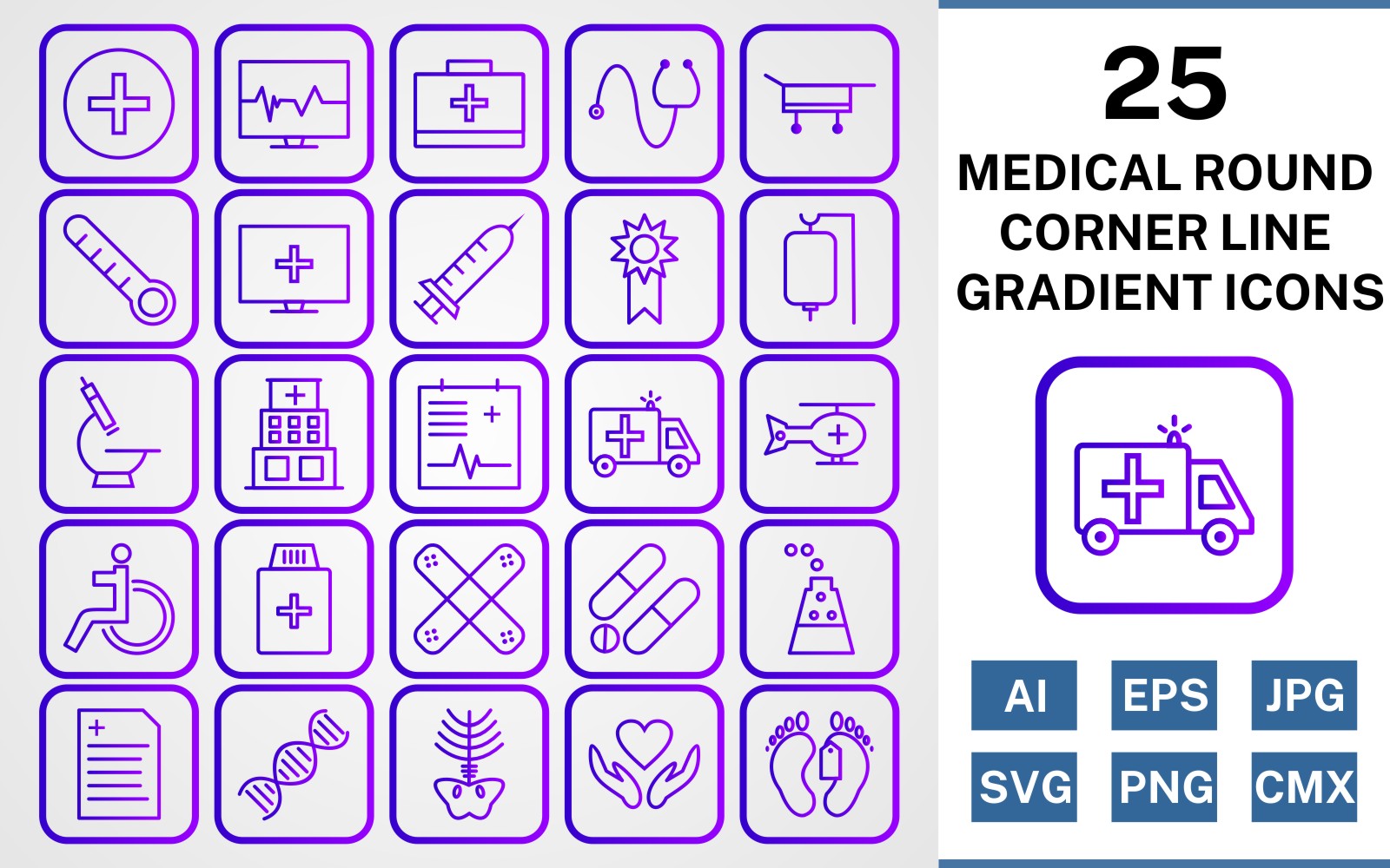 Download Набор иконок "25 Medical Round Corner Line Gradient Icon Set" / 25 Medical Round Corner Line Gradient Icon Set - Набор иконок на тему medical set,file,icon,icons,round,corner,vector,sign,symbol,pictogram,line gradient,medical,drip,xray,dna,report,toe tag,medicines,hospital,injection