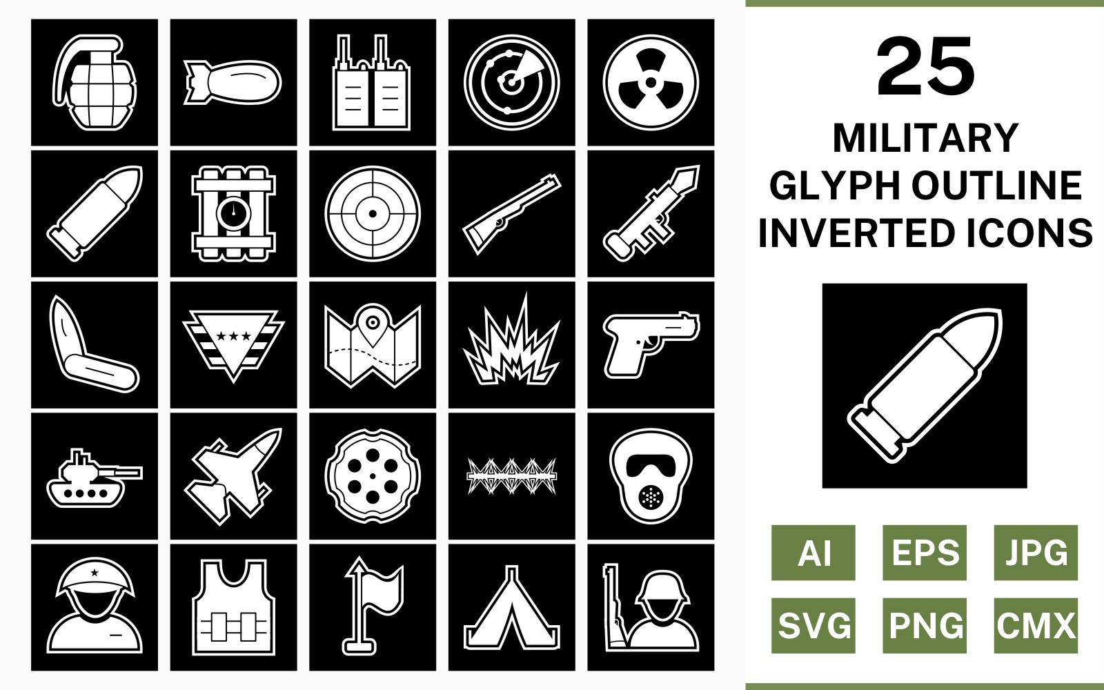 Download Набор иконок "25 Military Glyph Outline Inverted Icon Set" / 25 Military Glyph Outline Inverted Icon Set - Набор иконок на тему military set,file,icon,icons,outline,vector,sign,symbol,pictogram,glyph,inverted,military,bullet,target,grenade,jet,tent,gun,blast,radar