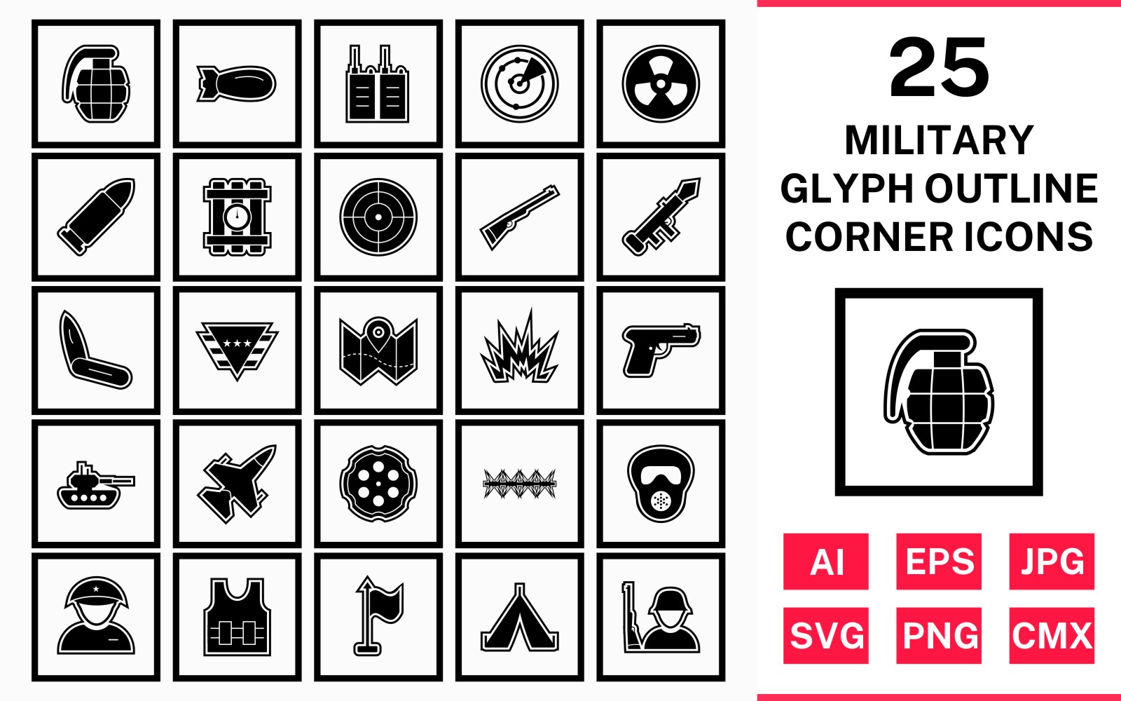Download Набор иконок "25 Military Glyph Outline Square Corner Icon Set" / 25 Military Glyph Outline Square Corner Icon Set - Набор иконок на тему military set,file,icon,icons,outline,vector,sign,symbol,pictogram,glyph,square,corner,military,bullet,target,grenade,jet,tent,gun,blast