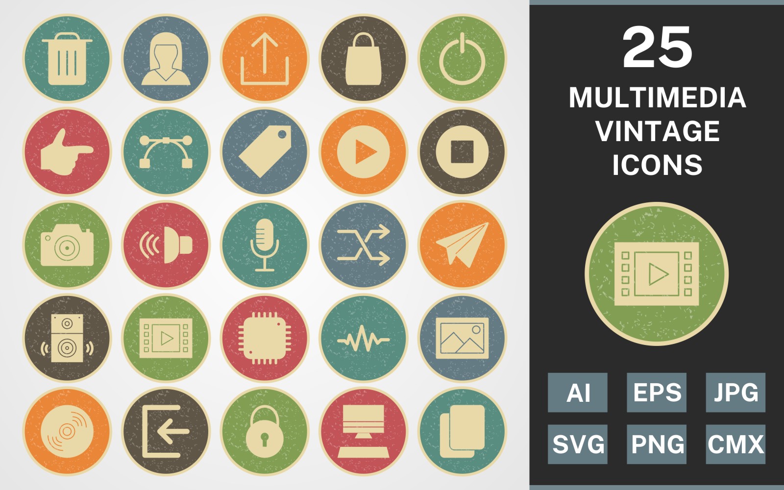 Download Набор иконок "25 MULTIMEDIA VINTAGE PACK Icon Set" / 25 MULTIMEDIA VINTAGE PACK Icon Set - Набор иконок на тему data set,file,icon,icons,vintage,round,vector,sign,symbol,pictogram,line,multimedia,logout,copy,shuffle,play,stop,upload,speaker,sign in