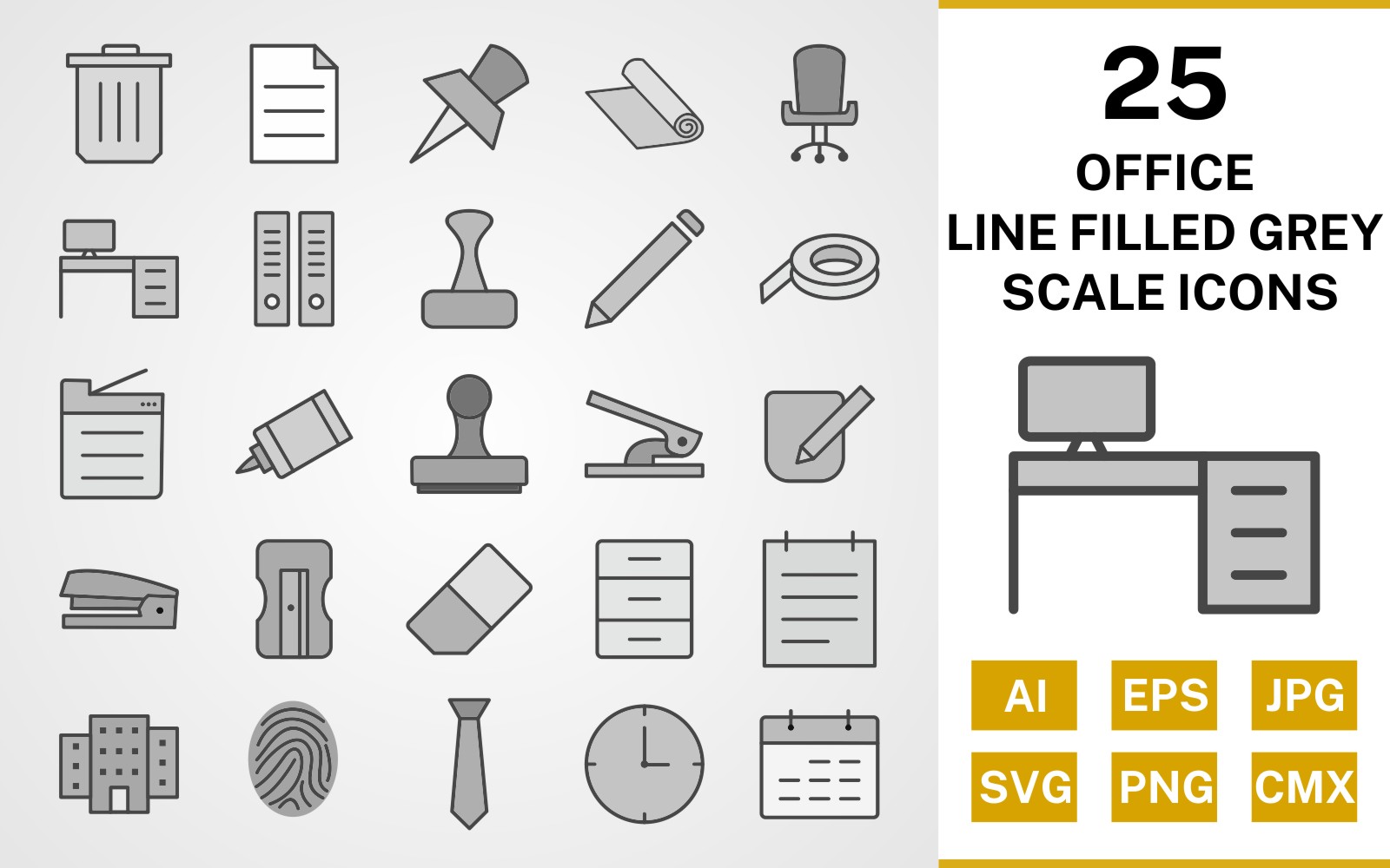 Download Набор иконок "25 Office Line Filled Greyscale Icon Set" / 25 Office Line Filled Greyscale Icon Set - Набор иконок на тему business set,file,icon,icons,line,filled,vector,sign,symbol,pictogram,greyscale,office,notepad,clock,tie,stamp,office chair,office table,post it,trash