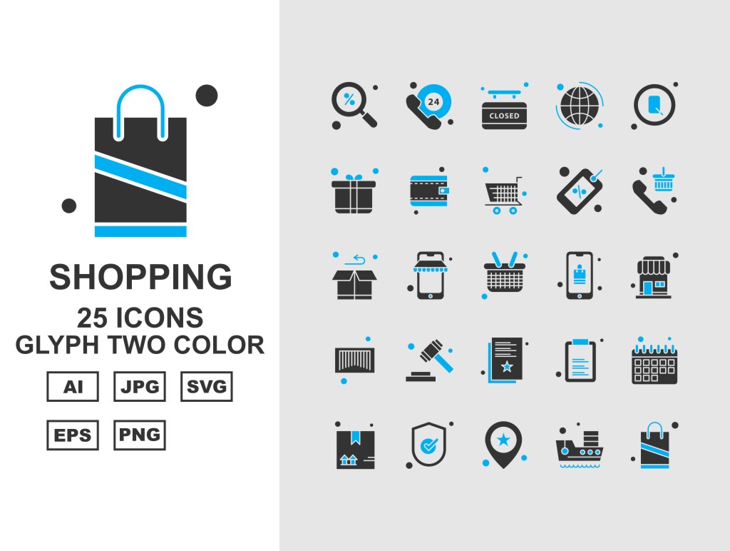 Download Набор иконок "25 Premium Business Glyph Two Color Icon Set" / 25 Premium Business Glyph Two Color Icon Set - Набор иконок на тему business label,ship,bag,box,document,best offer,trolley,shop,gift,credit card,percentage,wallet,cart,basketicon,icons