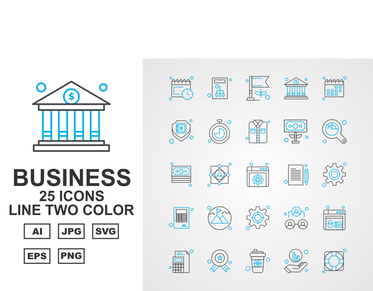 Download Набор иконок "25 Premium Business Line Two Color Icon Set" / 25 Premium Business Line Two Color Icon Set - Набор иконок на тему business calendar,user,leader,website,award,coffee,graph,target,server,flag,bank,shield,stopwatch,shirt,dollar,magnifying glass,document,setting,book,mountain