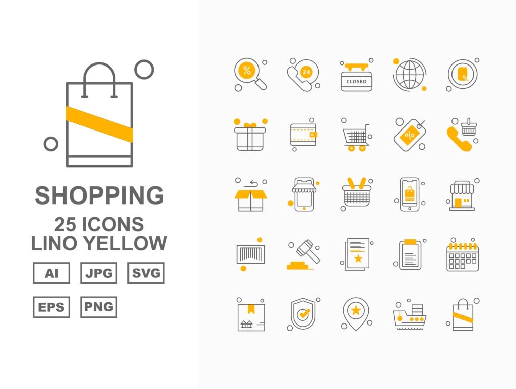 Download Набор иконок "25 Premium Business Lino Yellow Icon Set" / 25 Premium Business Lino Yellow Icon Set - Набор иконок на тему business label,ship,bag,box,document,best offer,trolley,shop,gift,credit card,percentage,wallet,cart,basketicon,icons