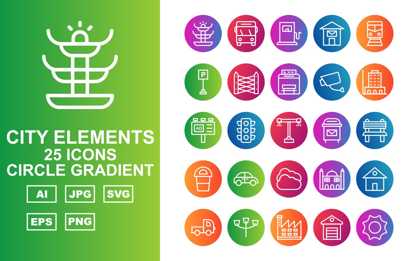 Download Набор иконок "25 Premium City Elements Circle Gradient Icon Set" / 25 Premium City Elements Circle Gradient Icon Set - Набор иконок на тему city fountain,traffic signal,factory,school,shop,hospital,hydrant,police station,vespa,bus,petrol,post office,trumway,parking,fence,bus stop,cctv,building,ads,road light