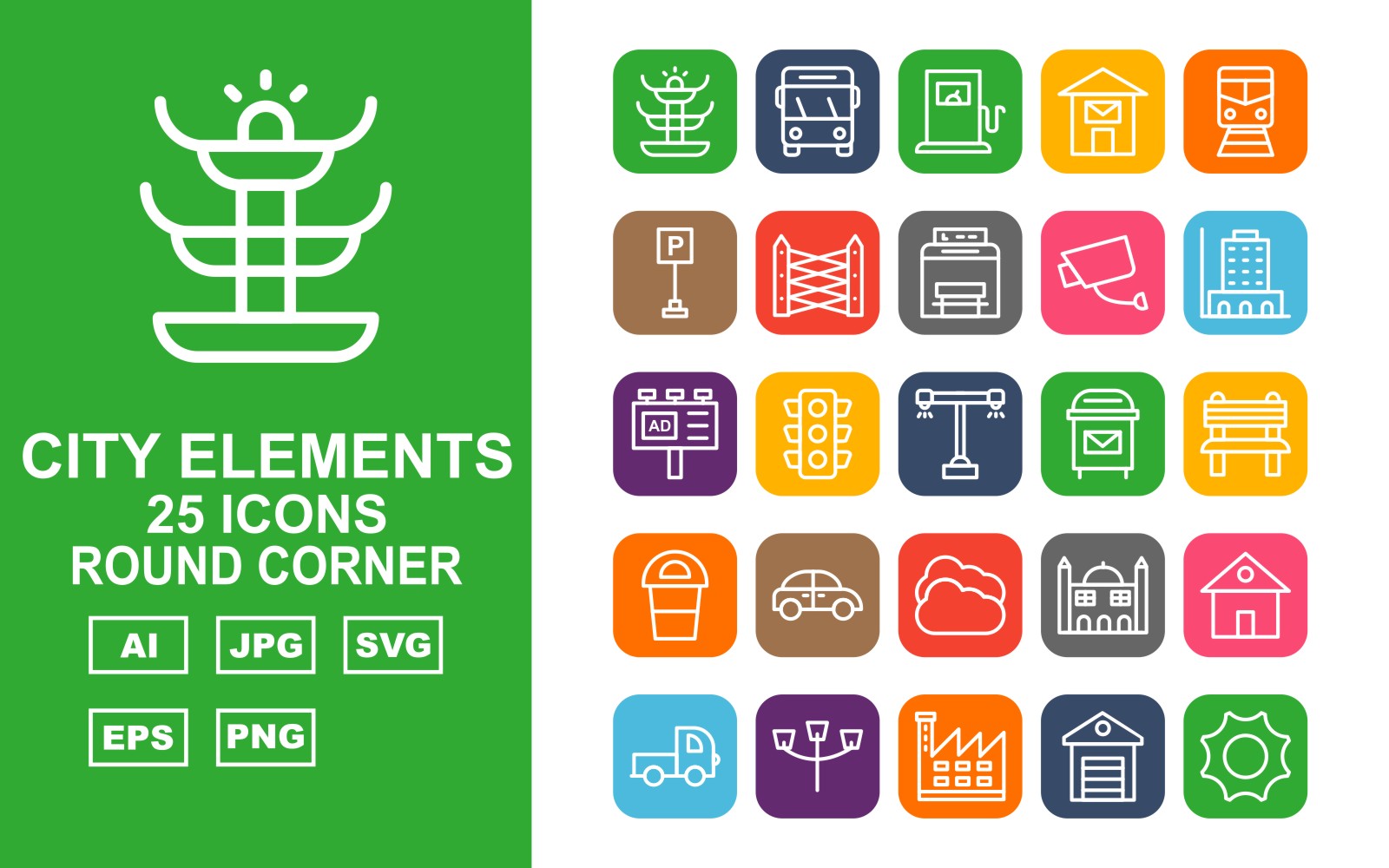 Download Набор иконок "25 Premium City Elements Round Corner Icon Set" / 25 Premium City Elements Round Corner Icon Set - Набор иконок на тему city fountain,traffic signal,factory,school,shop,hospital,hydrant,police station,vespa,bus,petrol,post office,trumway,parking,fence,bus stop,cctv,building,ads,road light