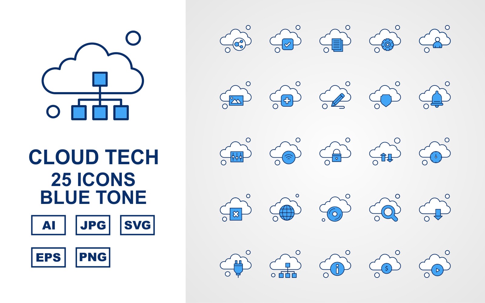 Download Набор иконок "25 Premium Cloud Tech Blue Tone Icon Set" / 25 Premium Cloud Tech Blue Tone Icon Set - Набор иконок на тему data link,wifi,search,download,plug,database,information,dollar,play,tick,document,setting,man,gallery,add,pencil,shield,bell,option,icon