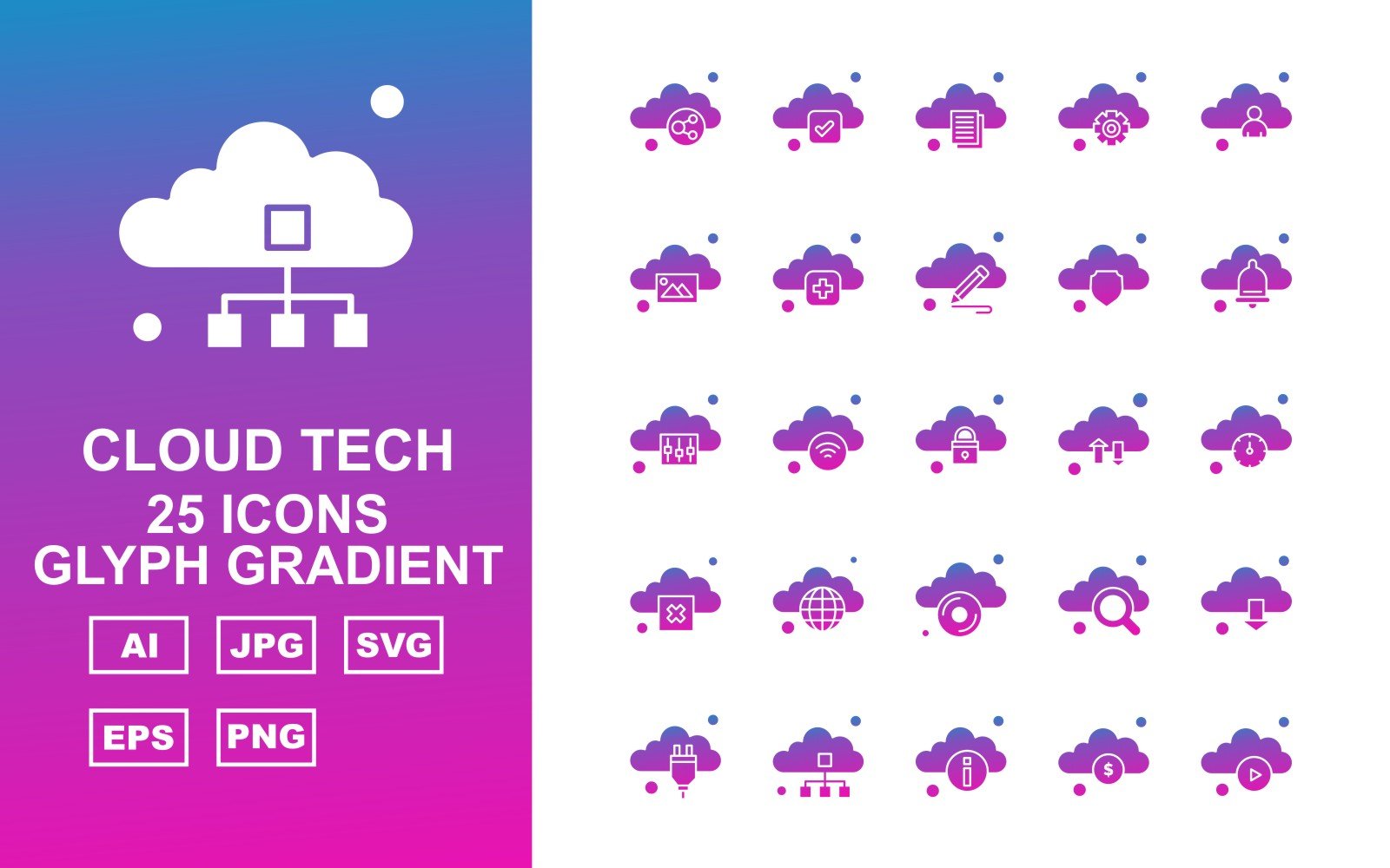 Download Набор иконок "25 Premium Cloud Tech Glyph Gradient Icon Set" / 25 Premium Cloud Tech Glyph Gradient Icon Set - Набор иконок на тему data link,wifi,search,download,plug,database,information,dollar,play,tick,document,setting,man,gallery,add,pencil,shield,bell,option,icon