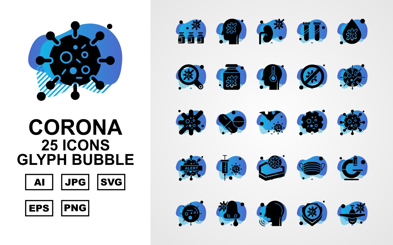 Download Набор иконок "25 Premium Corona Virus Glyph Bubble Icon Set" / 25 Premium Corona Virus Glyph Bubble Icon Set - Набор иконок на тему medical bottl,medicines,face mask,microscope,coronavirus,patient,shield,airplane,kidney,research,blood drop,search,bottle,block,covid 19,injection,icon,icons