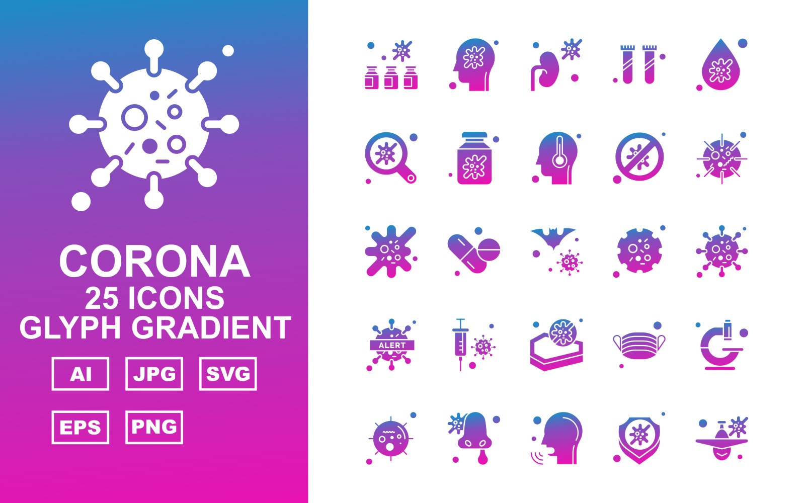 Download Набор иконок "25 Premium Corona Virus Glyph Gradient Icon Set" / 25 Premium Corona Virus Glyph Gradient Icon Set - Набор иконок на тему medical bottl,medicines,face mask,microscope,coronavirus,patient,shield,airplane,kidney,research,blood drop,search,bottle,block,covid 19,injection,icon,icons