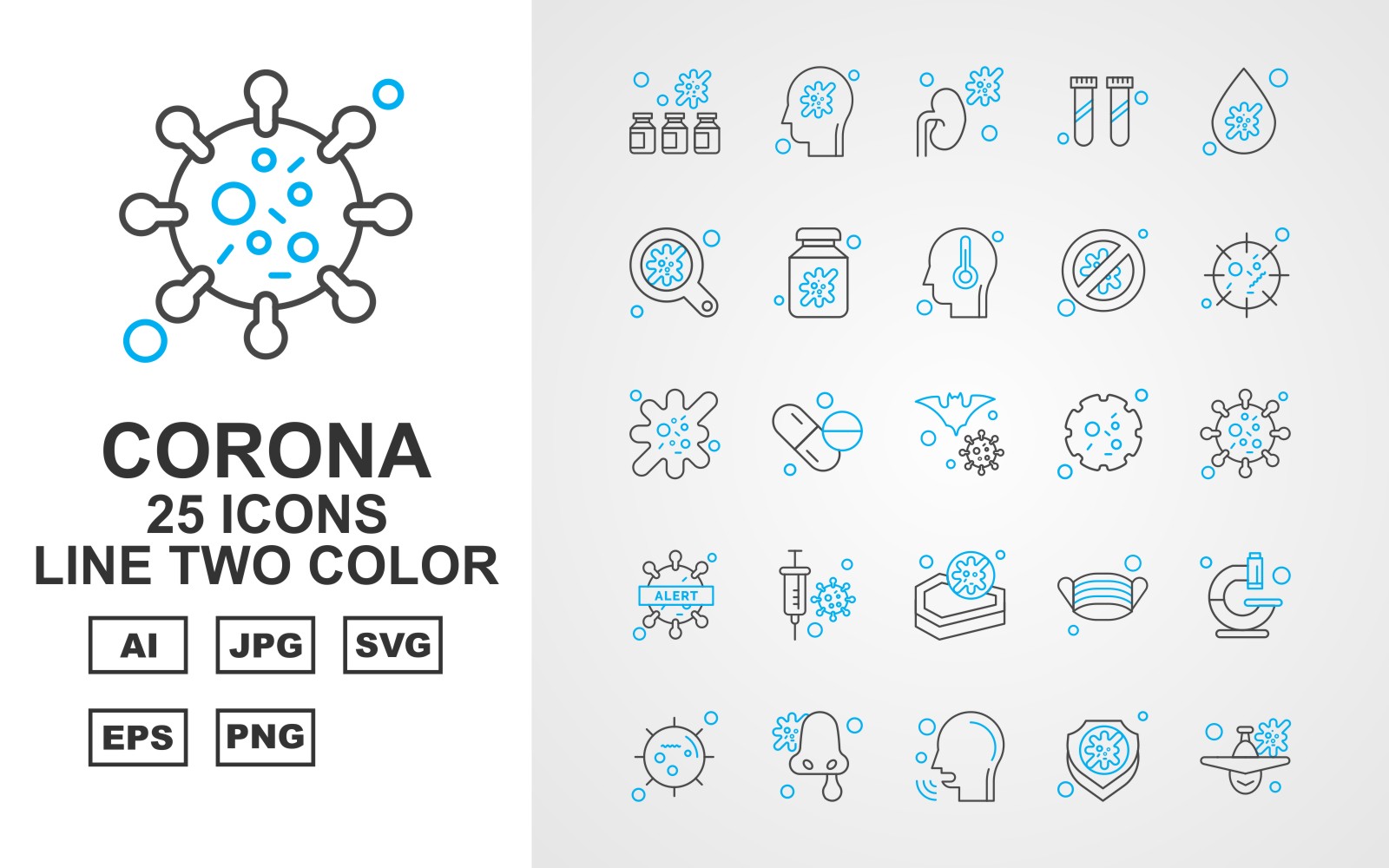 Download Набор иконок "25 Premium Corona Virus Line Two Color Icon Set" / 25 Premium Corona Virus Line Two Color Icon Set - Набор иконок на тему medical bottl,medicines,face mask,microscope,coronavirus,patient,shield,airplane,kidney,research,blood drop,search,bottle,block,covid 19,injection,icon,icons
