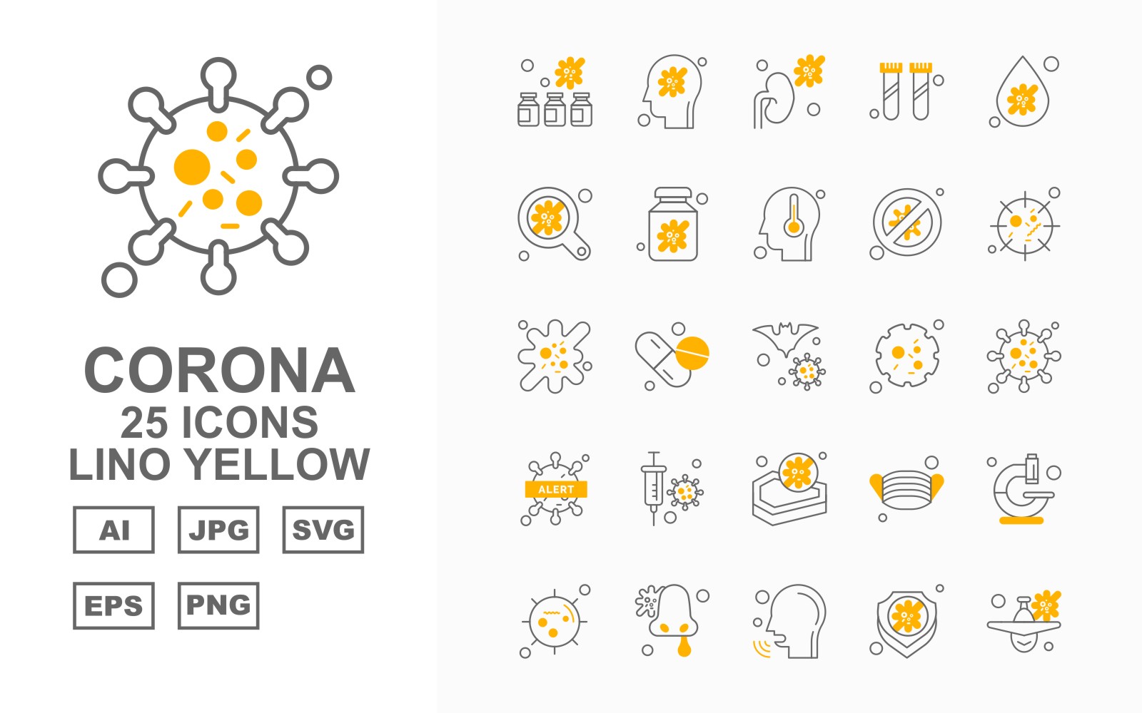 Download Набор иконок "25 Premium Corona Virus Lino Yellow Icon Set" / 25 Premium Corona Virus Lino Yellow Icon Set - Набор иконок на тему medical bottl,medicines,face mask,microscope,coronavirus,patient,shield,airplane,kidney,research,blood drop,search,bottle,block,covid 19,injection,icon,icons