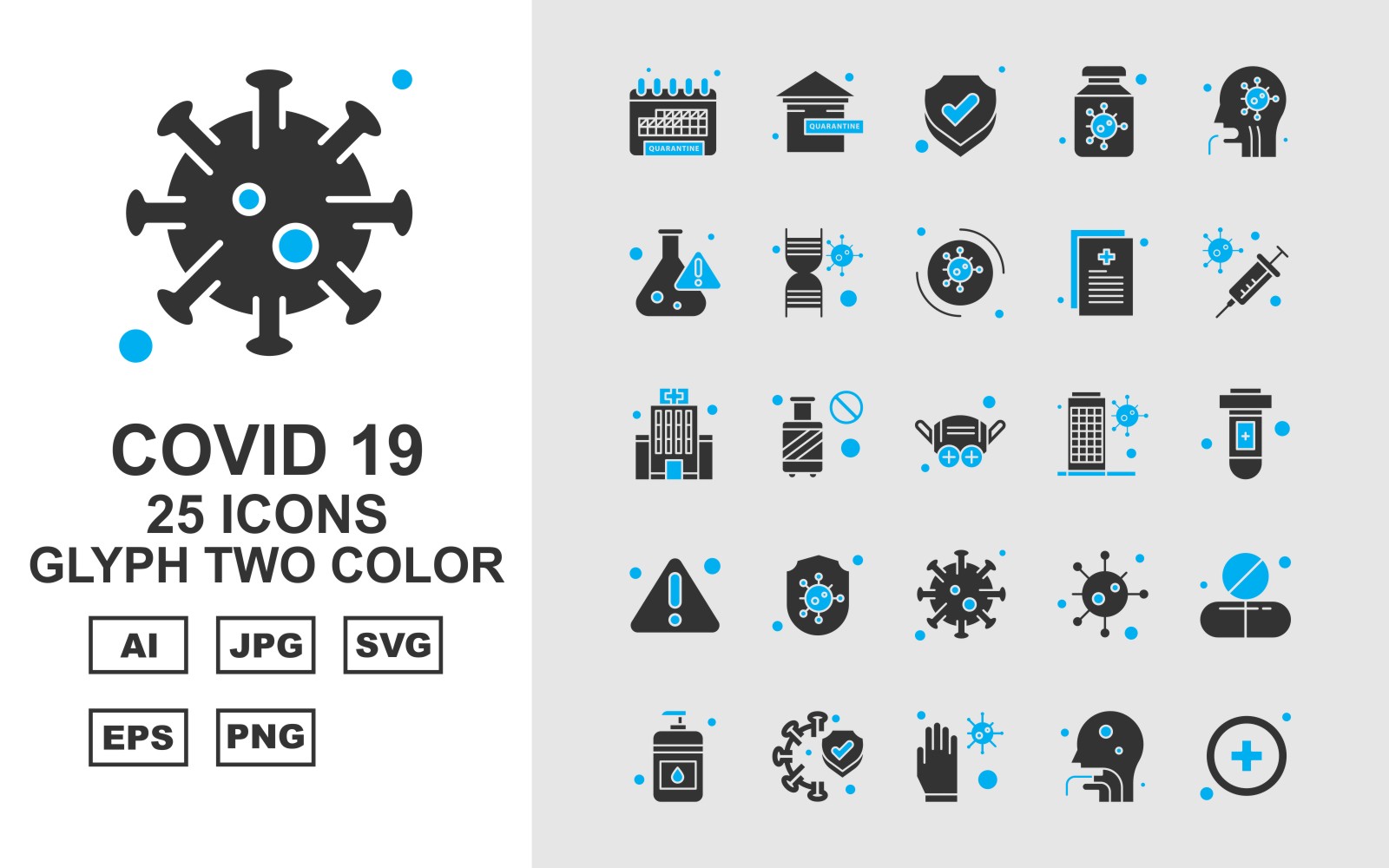 Download Набор иконок "25 Premium Covid 19 Glyph Two Color Icon Set" / 25 Premium Covid 19 Glyph Two Color Icon Set - Набор иконок на тему medical calendar,cylinder,corona virus,medicines,sanitizer,protect,glaves,person,add,home,shield,bottle,patient,research,dna,corona viru,icon,icons
