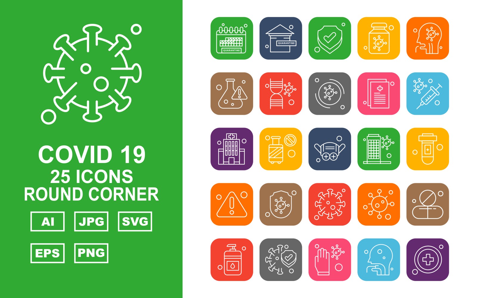Download Набор иконок "25 Premium Covid 19 Round Corner Icon Set" / 25 Premium Covid 19 Round Corner Icon Set - Набор иконок на тему medical calendar,cylinder,corona virus,medicines,sanitizer,protect,glaves,person,add,home,shield,bottle,patient,research,dna,corona viru,icon,icons