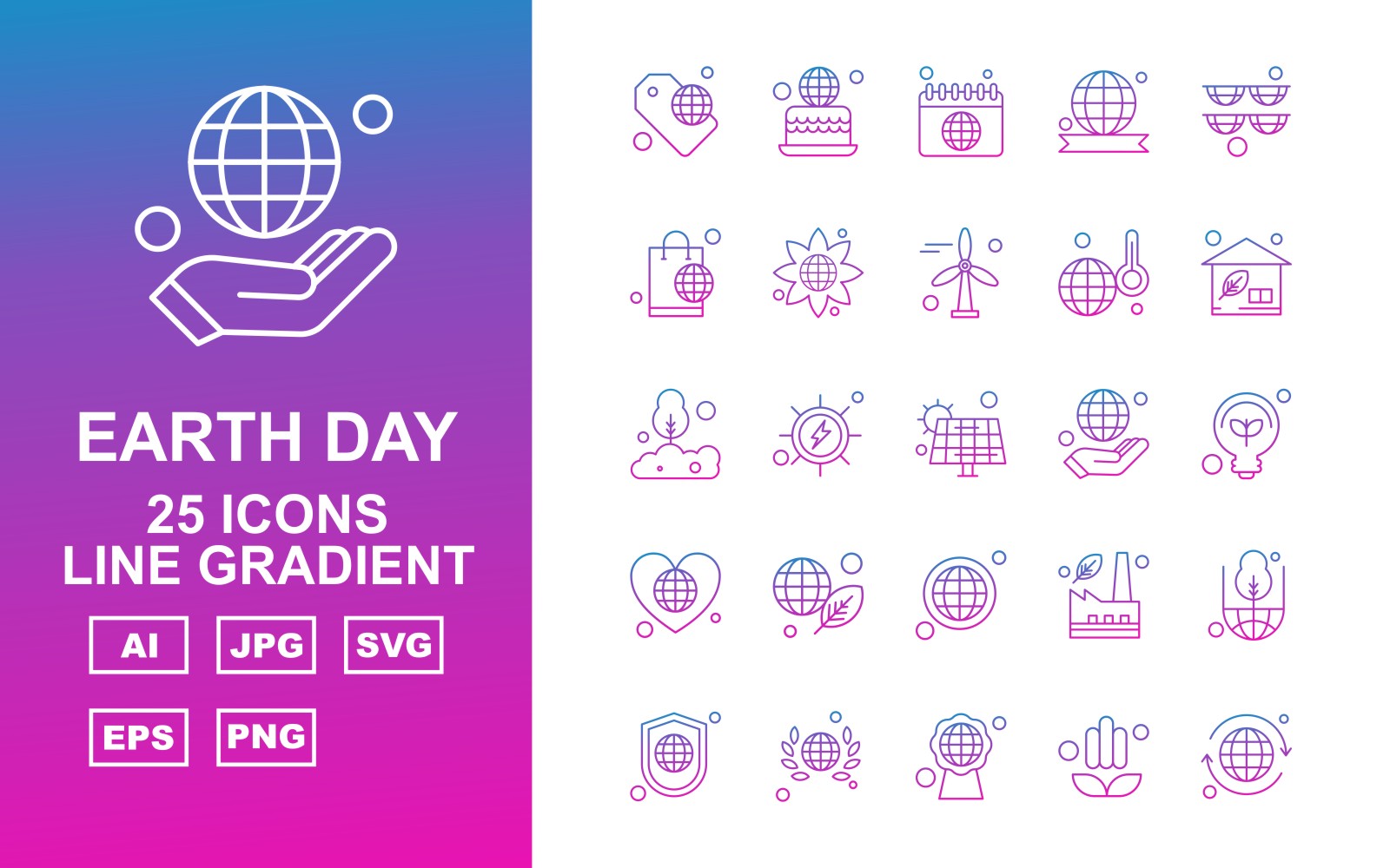 Download Набор иконок "25 Premium Earth Day Line Gradient Icon Set" / 25 Premium Earth Day Line Gradient Icon Set - Набор иконок на тему shopping tag,energy,factory,earth,shield,globe,logo,cake,calendar,shopping bag,sunflower,windmill,thermometer,home,tree,solar,hand,bulb,heart,icon